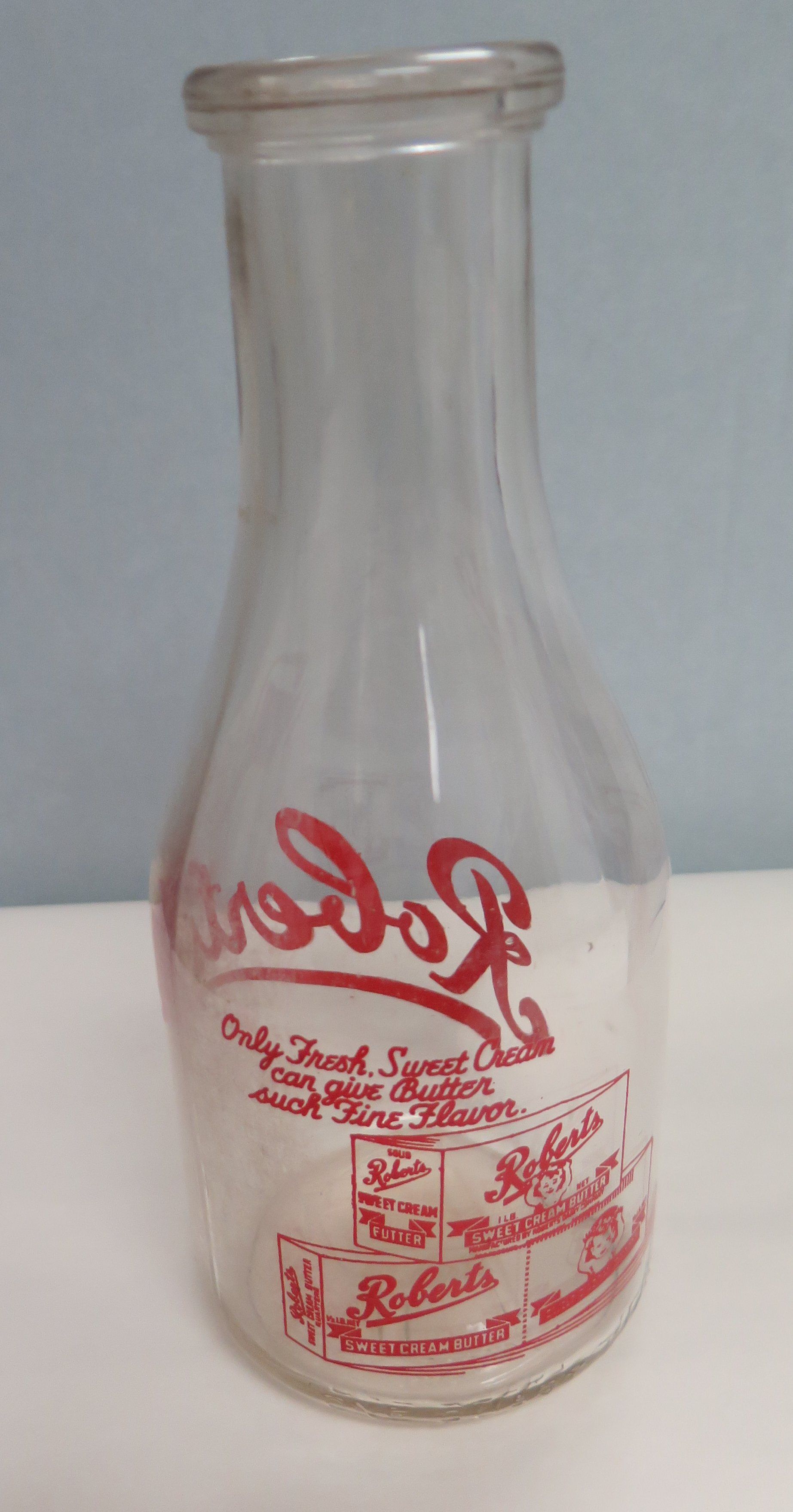 This is a clear glass milk bottle with a round base and a narrower opening at the top. The bottle has red text on the sides that reads, "Roberts/ Only Fresh, Sweet Cream/ can give Butter/ such Fine Flavor". The bottle measures 9.5" (h) x 3.75" (dia).