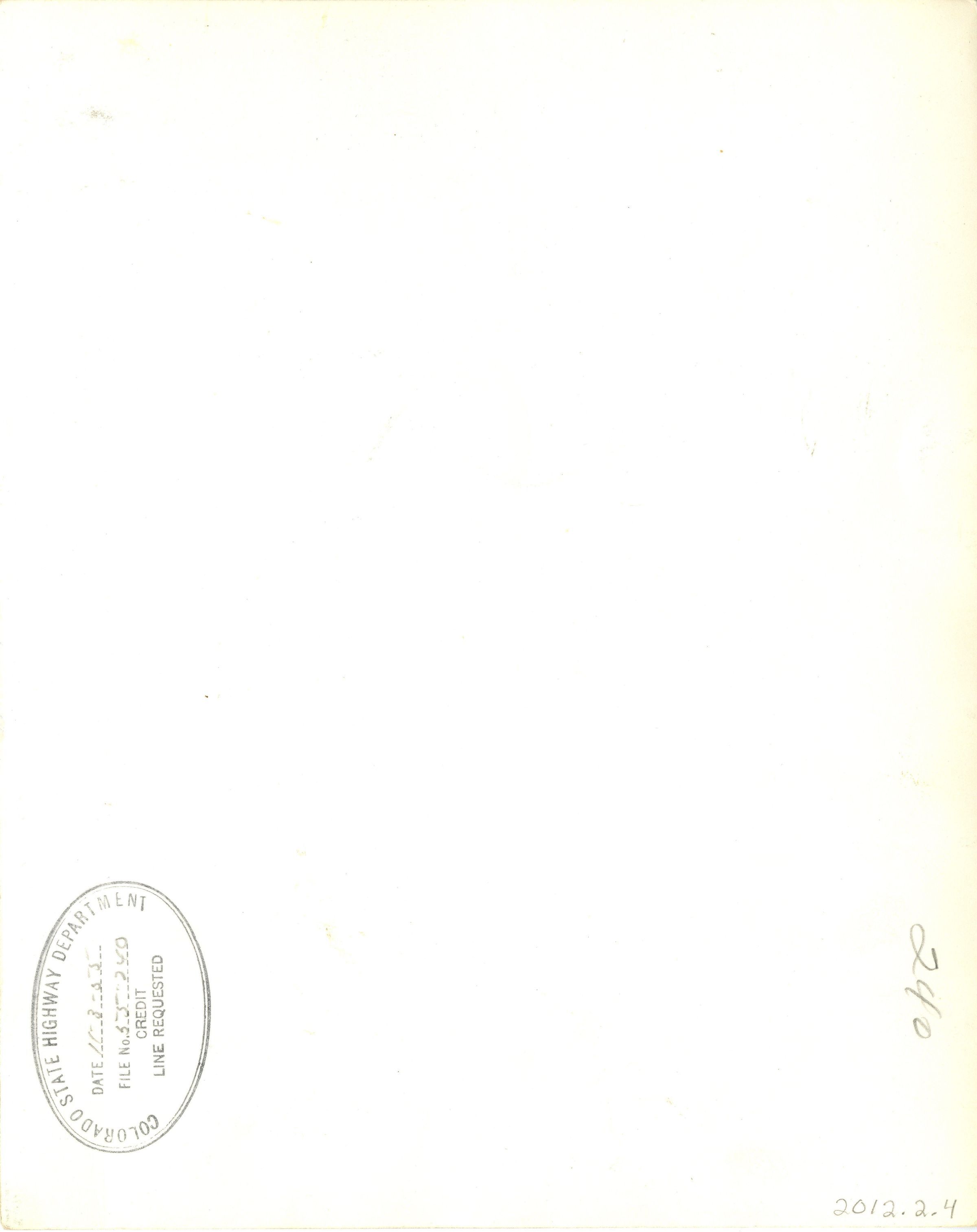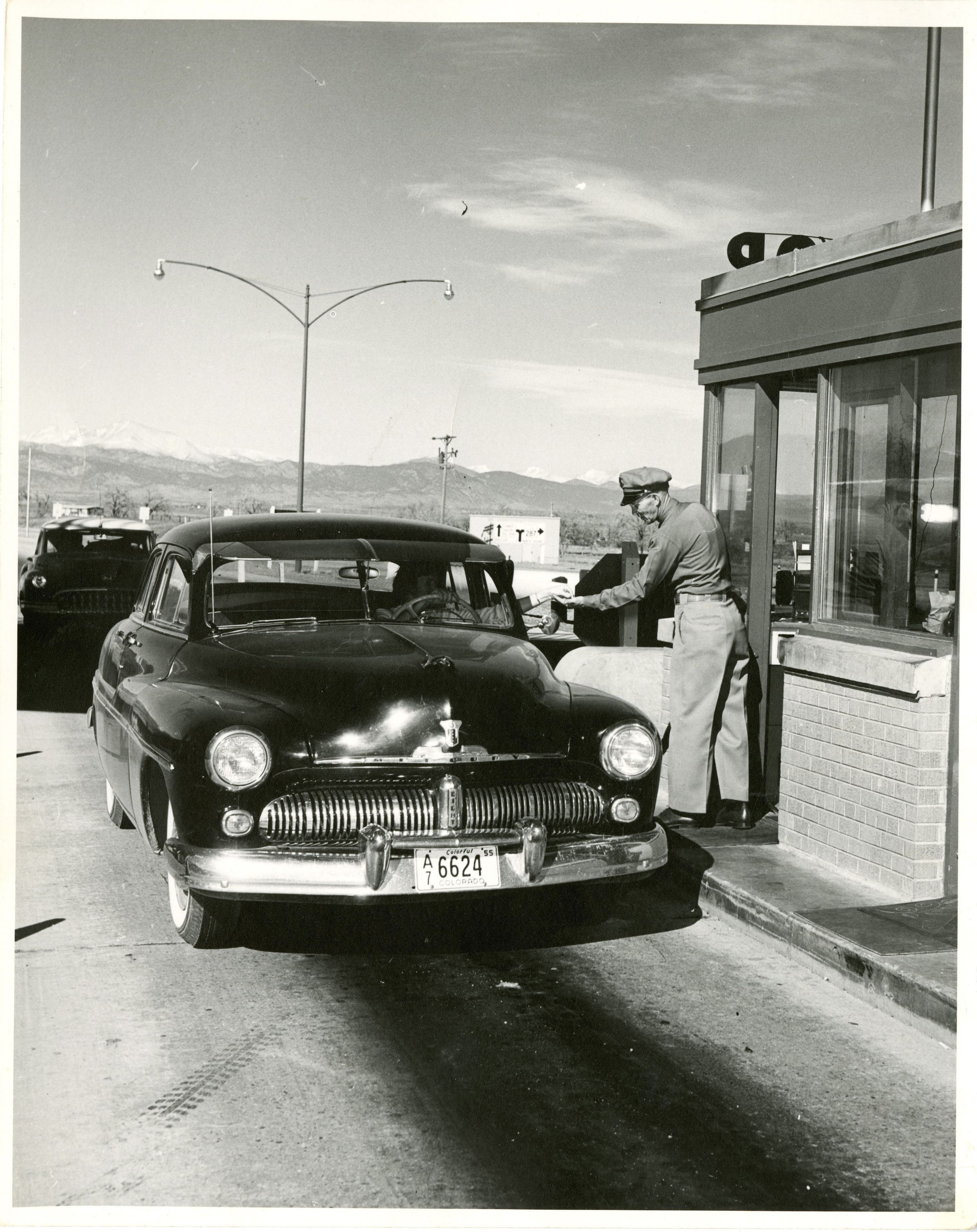 The photo depicts a tollbooth worker collecting money from a car stopping by. The car in the picture is a third generation Ford Mercury Eight. This car also has an old Colorful Colorado license plate. There is another car parked behind the one in the focus. A big light is behind the cars, and in the background are the mountains and a billboard showing directions to get onto US highway 287. There is one building in the background, one electricity pole, and a bunch of leafless trees.