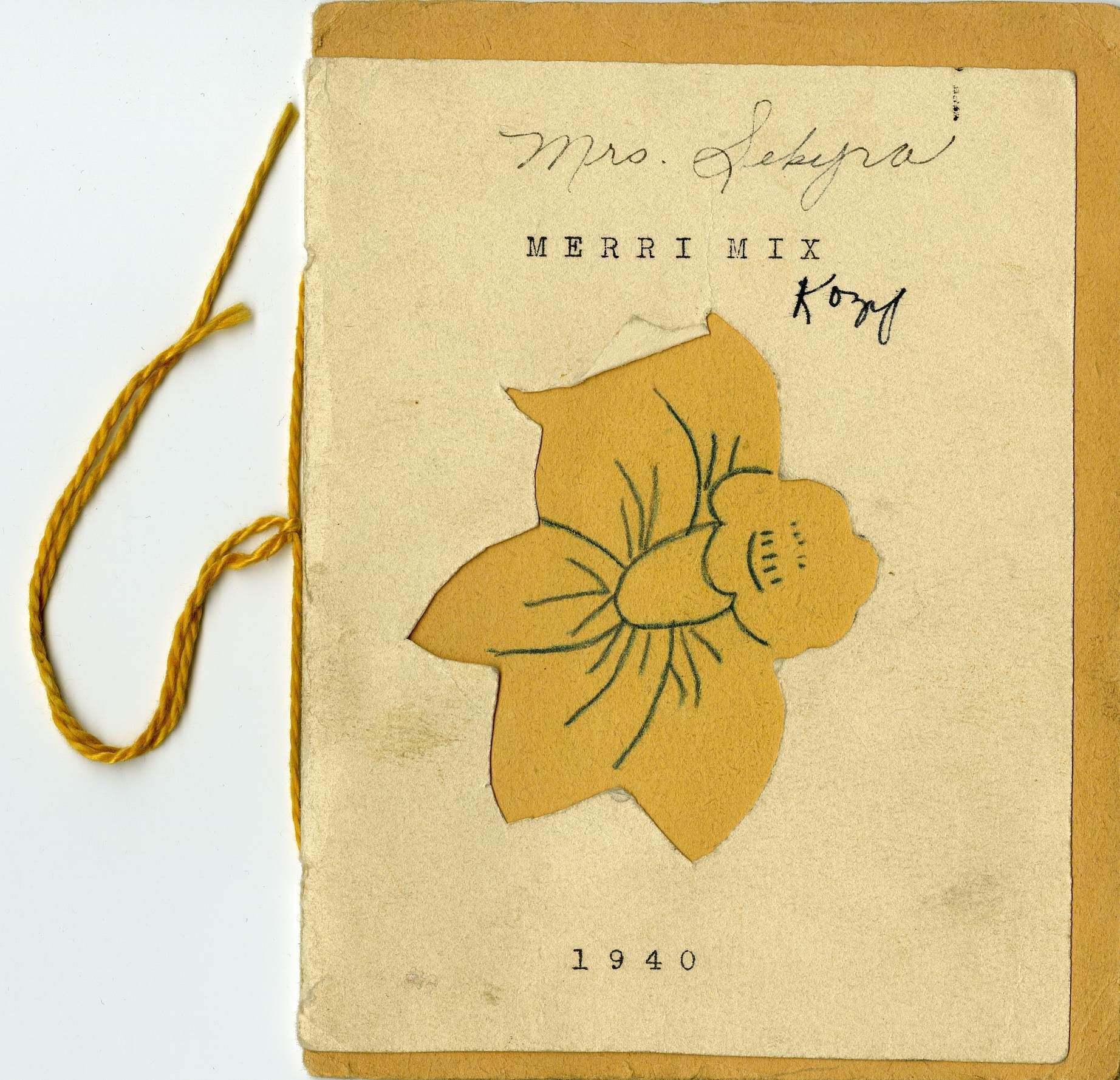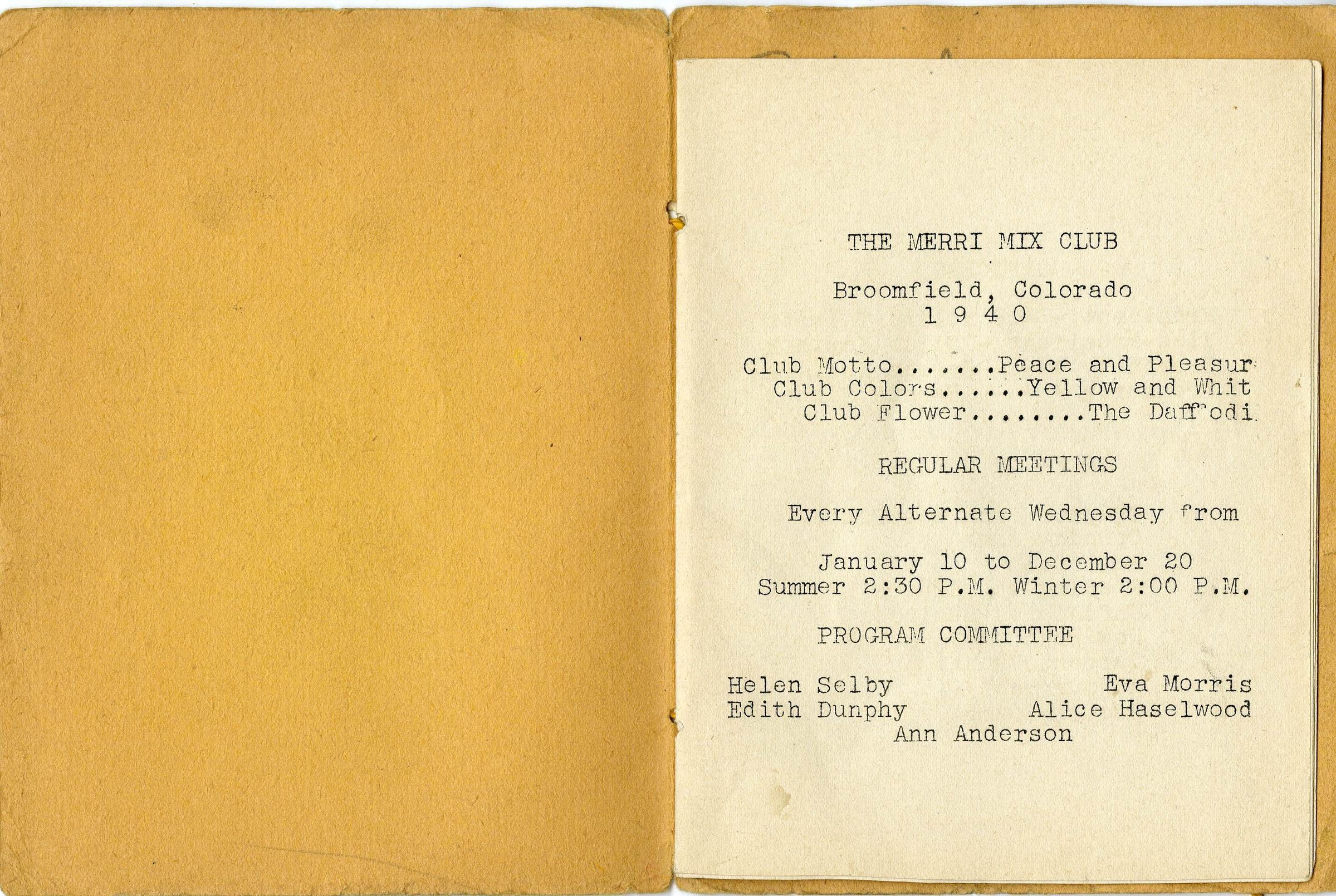 A Merri Mix Club program booklet, 1940. The booklet is 4.5" x 6," bound by thin yellow string or yarn. The cover has two layers, with the outermost layer containing a cut out in the shape of a daffodil flower. The second layer has pencil drawing filling in the detail of the flower. The text "Merri Mix" is printed at the top of the outer cover, with "1940" printed at the bottom. The text "Mrs. Sekyra" [sic] and "Kopf" or "Kopy" is handwritten on the outer cover in ink. The program contains the club's scheduling information for the year 1940, as well as listings of the club motto ("Peace and Pleasure"), club colors (yellow and white), club flower (daffodil), club officers, program committee, and meeting order of business. Regular meetings were held every alternate Wednesday from January 10 to December 20, starting at 2:30 PM in the Summer and 2:00 PM in the Winter. The meetings scheduled in the program list the date planned, hostesses, themed roll calls, discussions, performances, presentations, games, and any club elections. Members would often perform songs and dances, or present their papers, poems, and speeches that they created for the club at meetings. Many prominent Broomfield families had multiple women who were club members, such as the Koziseks, Mitzes, Brunners, and Crooks. The program is concluded with a poem, titled "Poem."