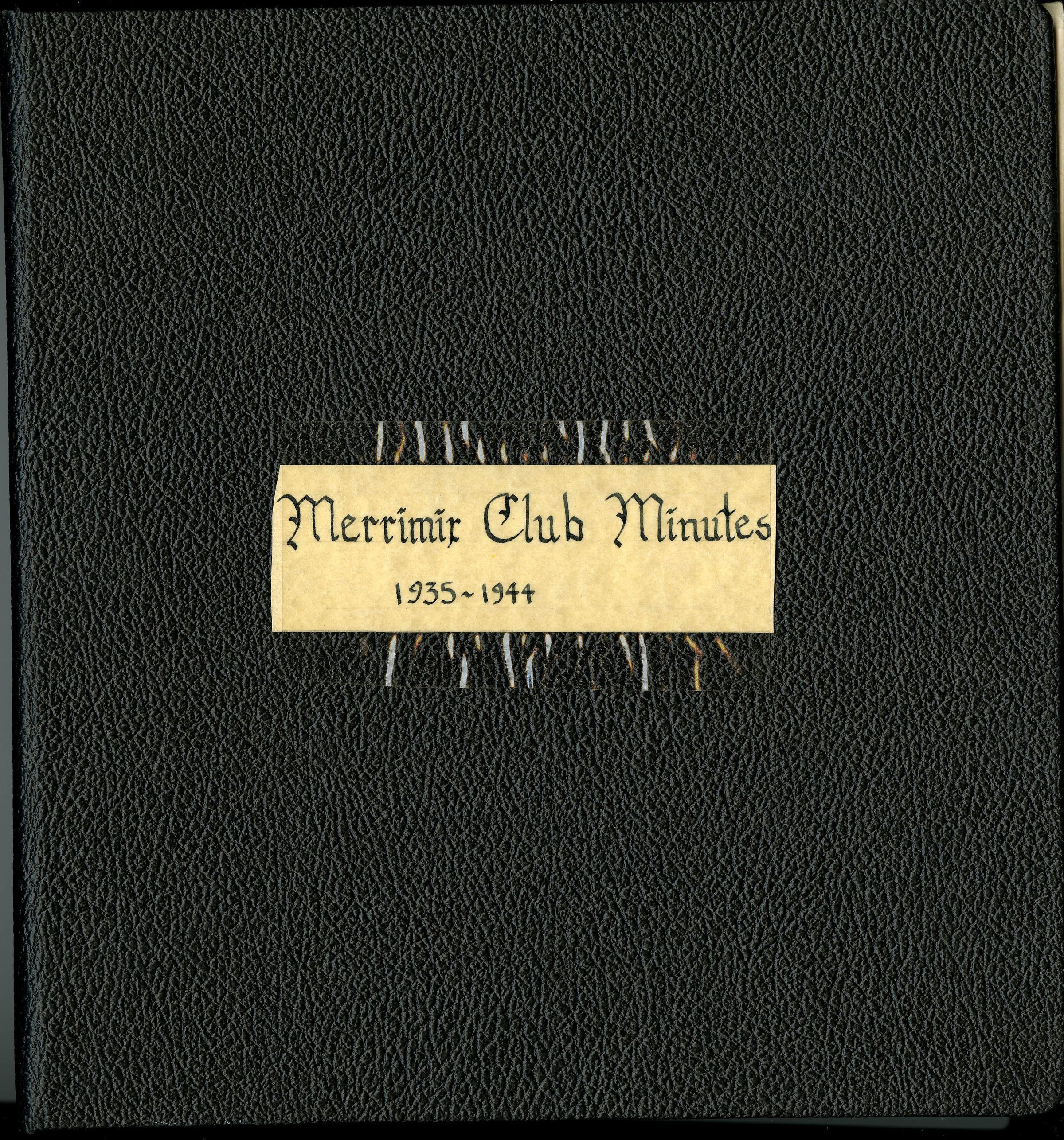 Merri Mix Club notebook of minutes, 1935-1944. The notebook is compiled in a three-ring binder with leather hard cover, 11" x 11.5" x 2.75". The notebook consists of several sleeved minute pages - handwritten and typed, depending on the Secretary writing - which document the club's activities from 1935 to 1945. The minutes include the Merri Mix constitution and by-laws, records of meeting attendance and dues payments, and records of meeting proceedings. Meeting activities such as opening prayers, singing, roll call, votes, officer installment, presentations, performances, general discussion, and special events such as luncheons and parties are all documented. All meetings were held at members' houses in Broomfield.