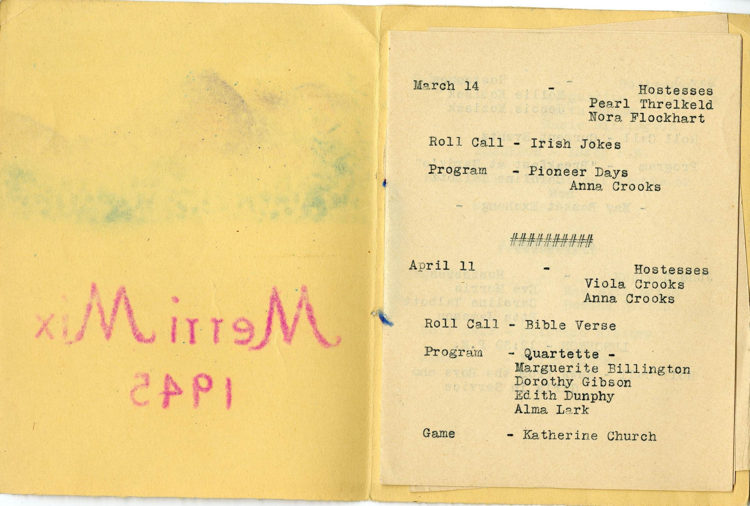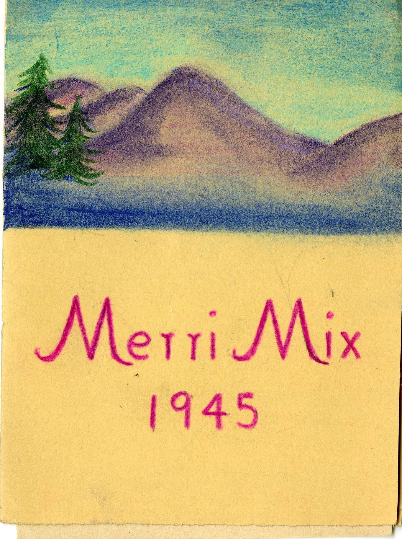 A Merri Mix Club program booklet, 1945. The booklet is 4.5" x 6," bound by purple string. The text "Merri Mix 1945" is written in purple crayon or pastel on the front of the cover, with a color crayon/pastel illustration of a mountain scene above it. The program contains some of the club's scheduling information for the year 1945, however several pages appear to be missing. The program also includes a list of Merri Mix club members. The meetings scheduled in the program list the date planned, hostesses, themed roll calls, discussions, performances, presentations, games, and any club elections. Members would often perform songs and dances, or present their papers, poems, and speeches that they created for the club at meetings. Many prominent Broomfield families had multiple women who were club members, such as the Koziseks, Mitzes, Brunners, and Crooks.