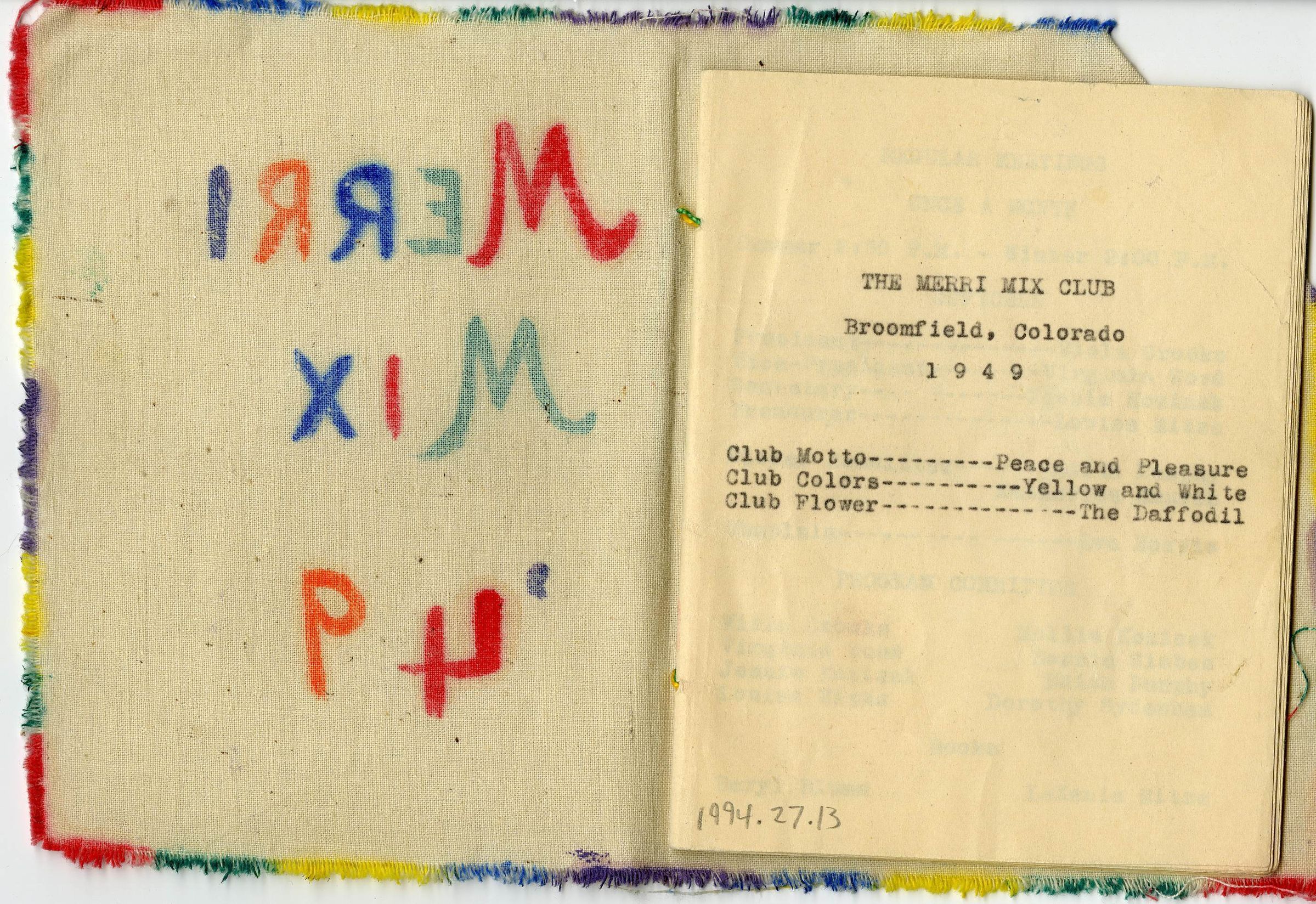 A Merri Mix Club program booklet, 1949. The booklet is 4.75" x 6," bound by a gold string. The cover is cloth fabric with multicolored fringe, with the text "Merri Mix '49" painted in the center in several colors for each letter. The program contains the club's scheduling information for the year 1949, as well as listings of the club motto ("Peace and Pleasure"), club colors (yellow and white), club flower (daffodil), program committee, officers, members, and meeting order of business. Regular meetings were held once a month, starting at 2:30 PM in the Summer and 2:00 PM in the Winter. The meetings scheduled in the program list the date planned, hostesses, themed roll calls, discussions, performances, presentations, games, and any club elections. Members would often perform songs and dances, or present their papers, poems, and speeches that they created for the club at meetings. Many prominent Broomfield families had multiple women who were club members, such as the Koziseks, Mitzes, Brunners, and Crooks. The program is concluded with a poem, "A Guiding Star" by Florence Scott.
