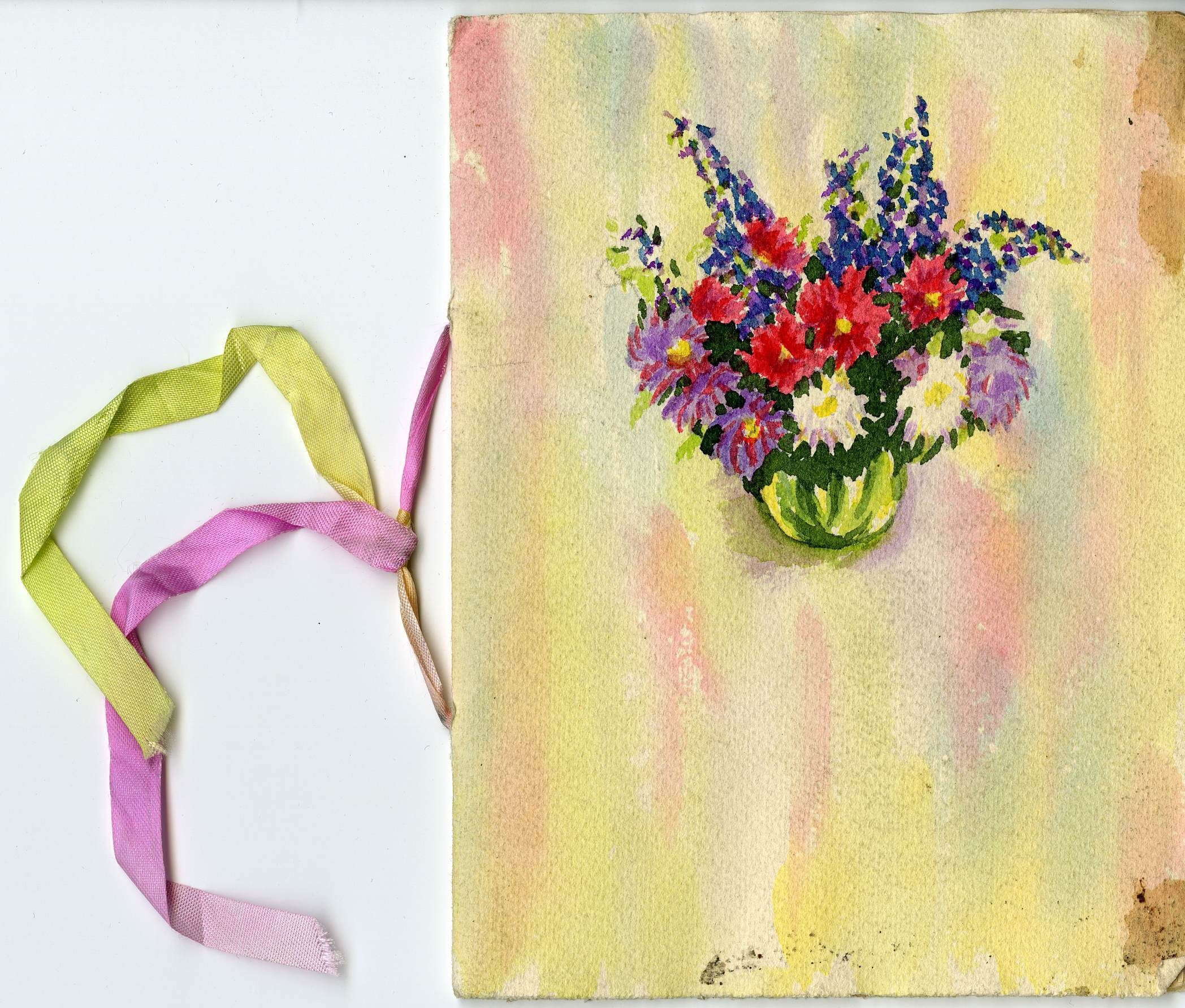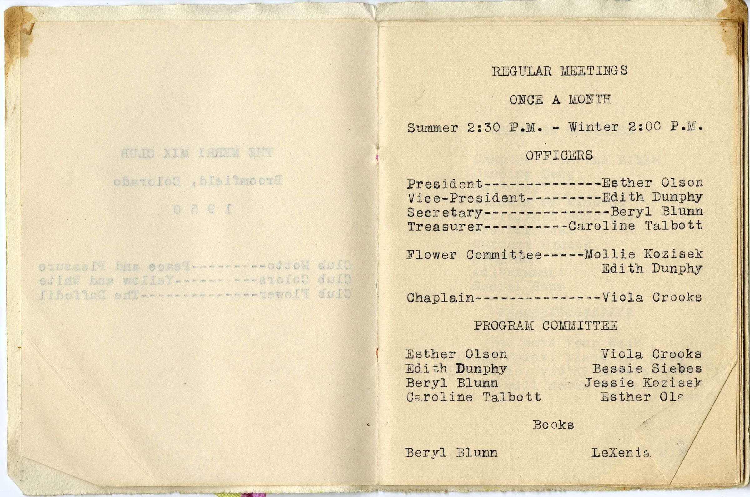 A Merri Mix Club program booklet, 1950. The booklet is 4.5" x 5.75," bound by yellow and pink ribbon. The cover is cream colored, with a color, painted illustration of a pot of flowers on the front. The program contains the club's scheduling information for the year 1950, as well as listings of the club motto ("Peace and Pleasure"), club colors (yellow and white), club flower (daffodil), program committee, officers, members, and meeting order of business. Regular meetings were held once a month, starting at 2:30 PM in the Summer and 2:00 PM in the Winter. The meetings scheduled in the program list the date planned, hostesses, themed roll calls, discussions, performances, presentations, games, and any club elections. Members would often perform songs and dances, or present their papers, poems, and speeches that they created for the club at meetings. Many prominent Broomfield families had multiple women who were club members, such as the Koziseks, Mitzes, Brunners, and Crooks.