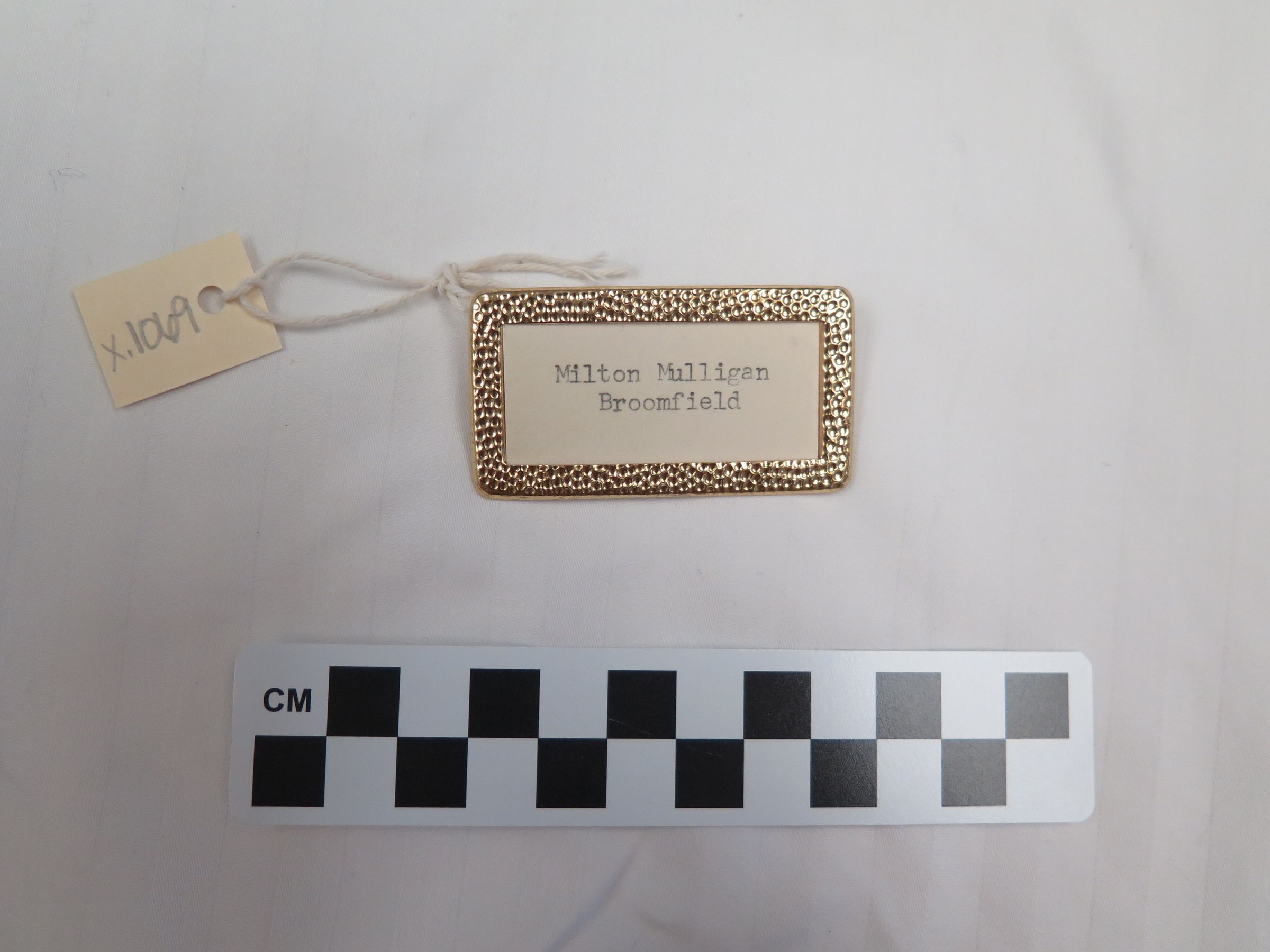 This is a metal nametag with a pin closure on the back. The nametag has a piece of paper in it with the text "Milton Mulligan/ Broomfield" typed on it. The nametag measures 2.25" (w) x 1.25" (l).