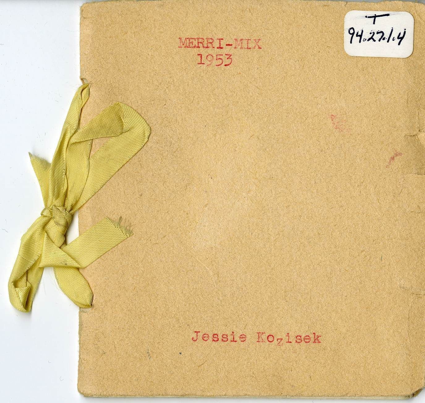 A Merri Mix Club program booklet, 1953. The booklet is 3.75" x 4.25," bound by yellow ribbon. The cover is cream colored, with the text "Merri-Mix 1953" and "Jessie Kozisek" (the original owner of the program) printed on the front. The program contains the club's scheduling information for the year 1950, as well as listings of the club motto ("Peace and Pleasure"), club colors (yellow and white), club flower (daffodil), program committee, officers, members, and meeting order of business. Regular meetings were held once a month at 1:30 PM. The meetings scheduled in the program list the date planned, hostesses, themed roll calls, discussions, performances, presentations, games, and any club elections. Members would often perform songs and dances, or present their papers, poems, and speeches that they created for the club at meetings. Many prominent Broomfield families had multiple women who were club members, such as the Koziseks, Mitzes, Brunners, and Crooks.