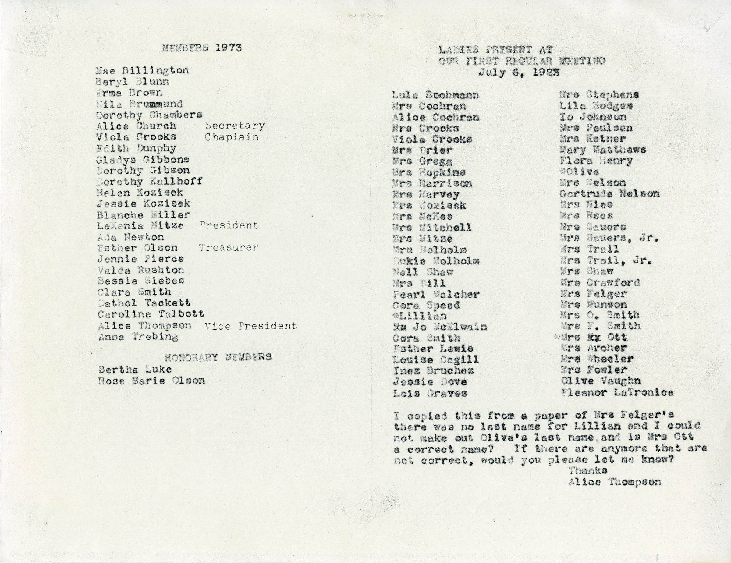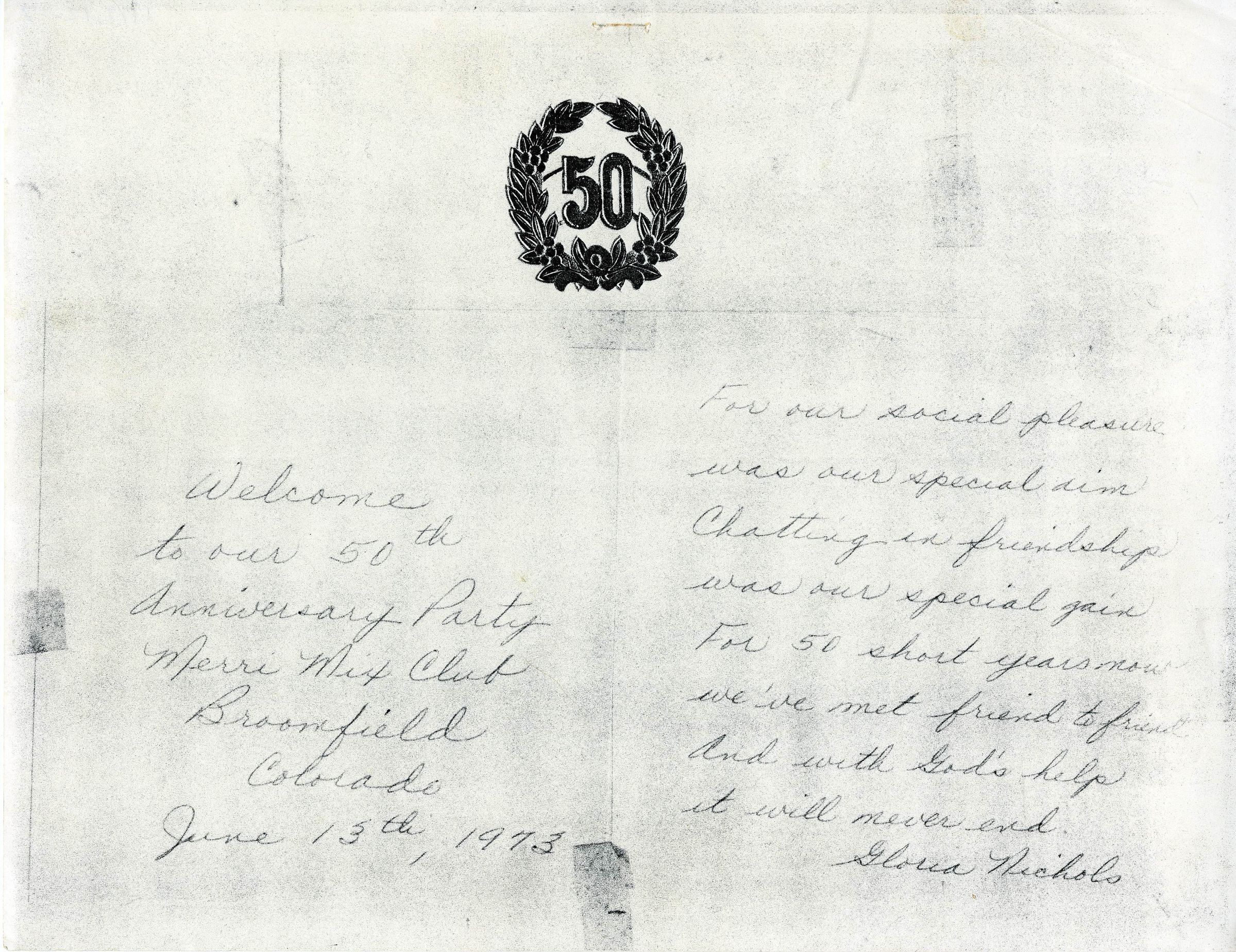 Photocopy packet of Merrie Mix Club membership lists, originally dated 1924 and 1973. The first list in the packet is from the Club's 50th Anniversary Party in 1973, including a message of welcome from member Gloria Nichols, the 1973 membership list (with officers), and the 1923 list of ladies present at the club's first meeting. The second list is a copy from a Merri Mix Club program for the year 1924, which includes the title page with club motto, meeting times, and program committee list, as well as the list of members. Original handwritten notes emphasisze Ada Crawford, (mother of Miles Crawford) and also list additional members not printed on the original list. The list was photocopied by Miles for his own historical research on Broomfield on August 10, 1978.Collection
