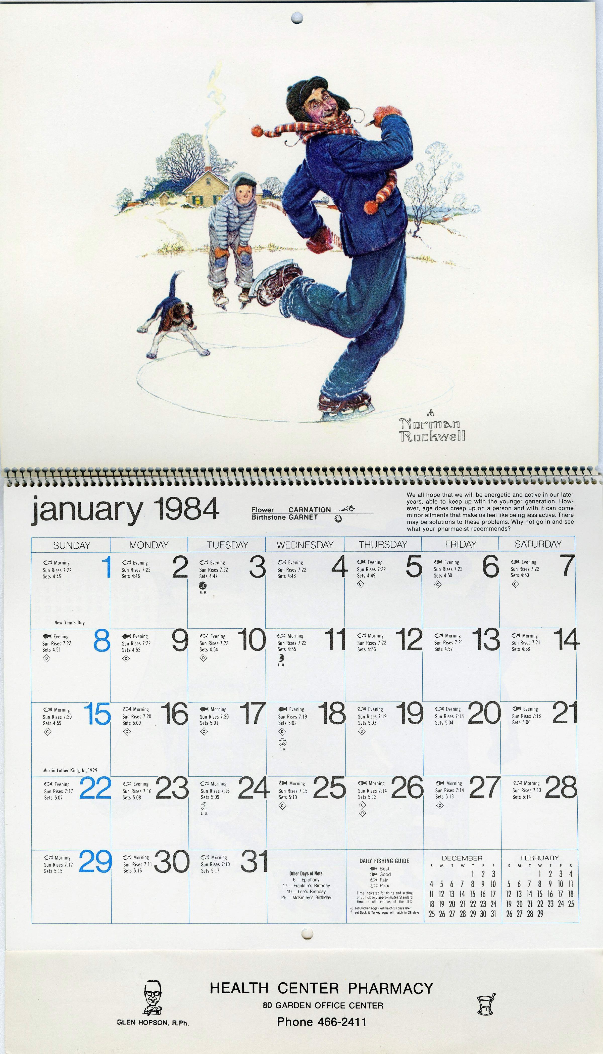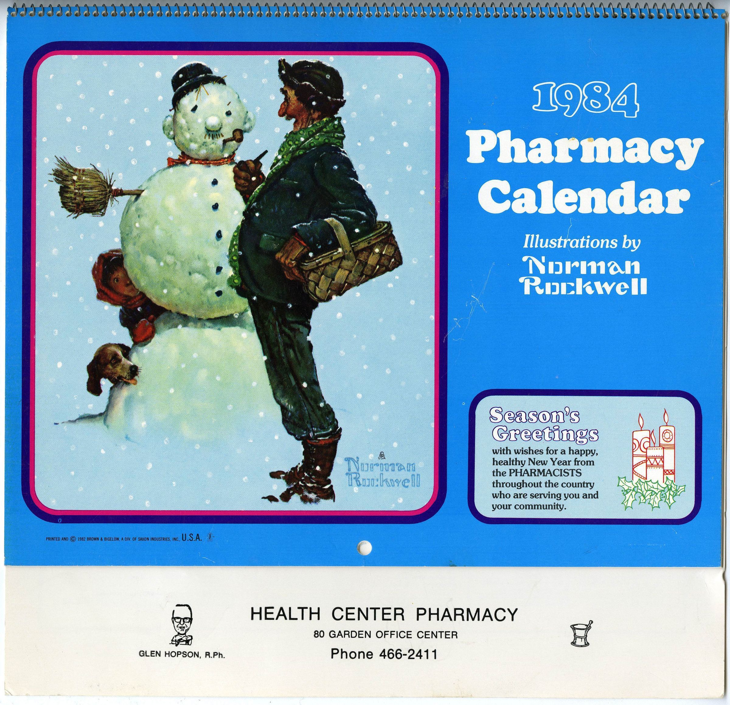 A 12-month calendar circulated by Health Center Pharmacy, 1984. The calendar is 9.5" x 10" when closed, 10" x 17" when open. The front has a Norman Rockwell illustration of a man with a pipe looking at a snowman, with a child and dog peering from behind the snowman. Each month also has a Rockwell illustration. The back cover page is longer than the calndar pages, with charts for writing in family prescription and immunization records. The reverse side has American Medical Association first aid recommendations printed. The second to last page also has information on life-saving tips for injuries and bleeding. When closed, the calendar has a banner at the bottom with the Health Center Pharmacy's address information at 80 Garden Center, phone number 466-2411. Glen Hopson, R.Ph. is listed as the pharmacist, with a small cartoon illustration of him.Collection