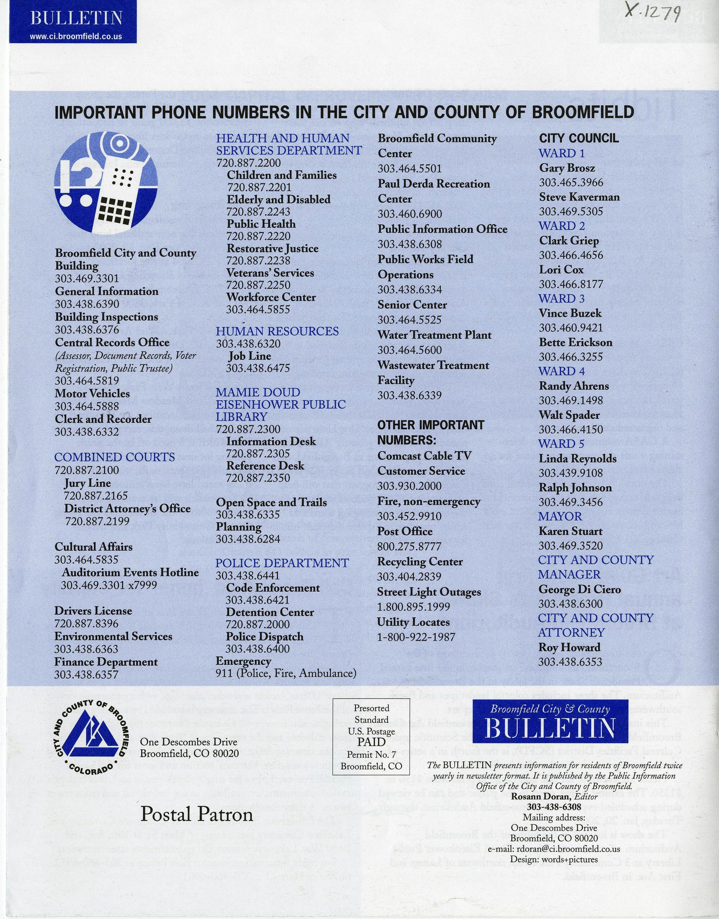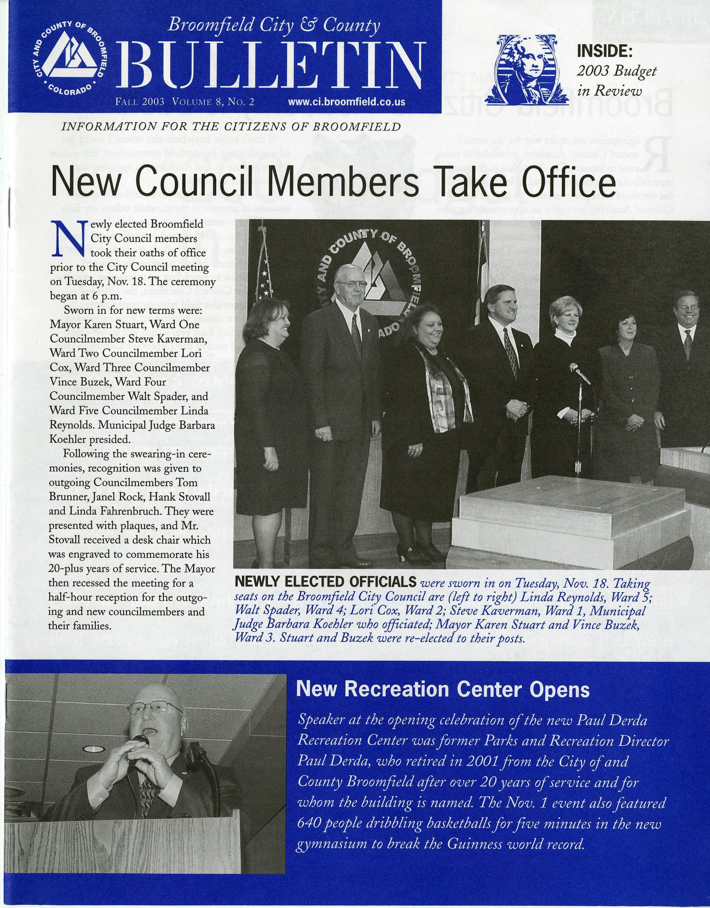 A bulletin for the City and County of Broomfield, 2003, Volume 8, No. 2. The bulletin measures 8.5" x 11". The bulletin features new council members taking office on the front, with budget information and other articles on the inside. Important phone numbers in the City and County are listed on the back.Collection