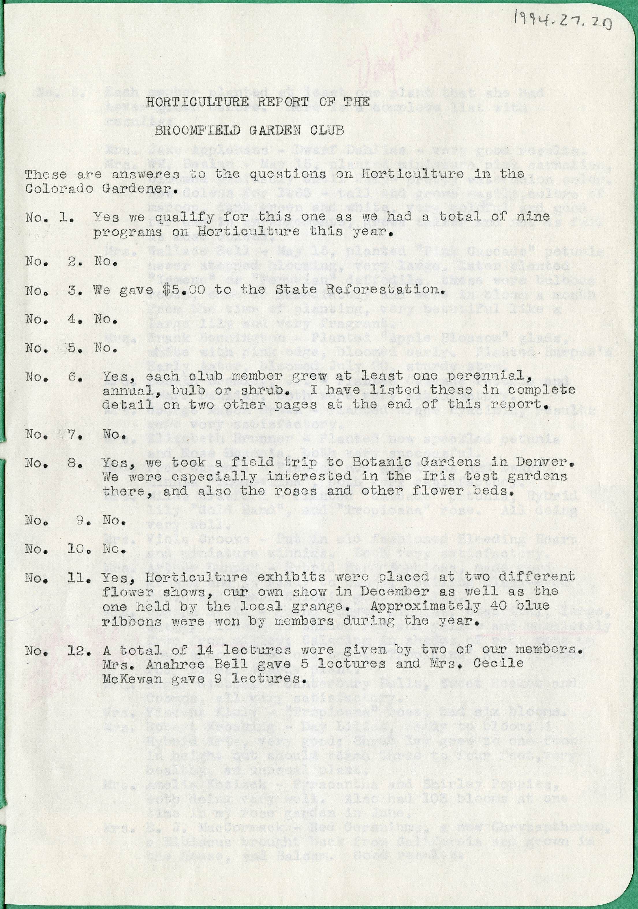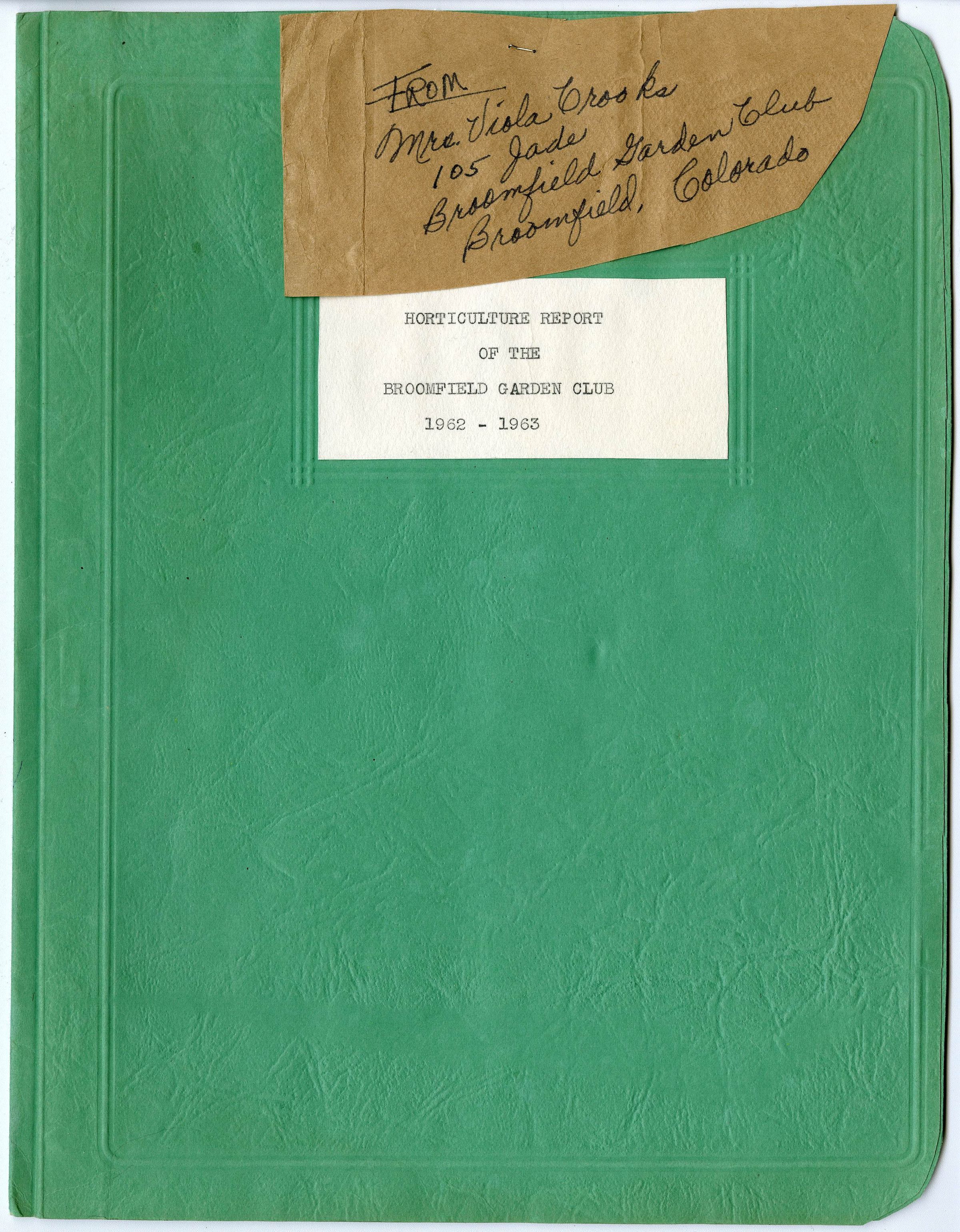 Custodial History: Report and several other papers of the same collection donated to the Broomfield Depot Museum in 1994 by Helen Kozisek. Women in her family were members of the Broomfield Garden Club from 1956 into the 1970s.