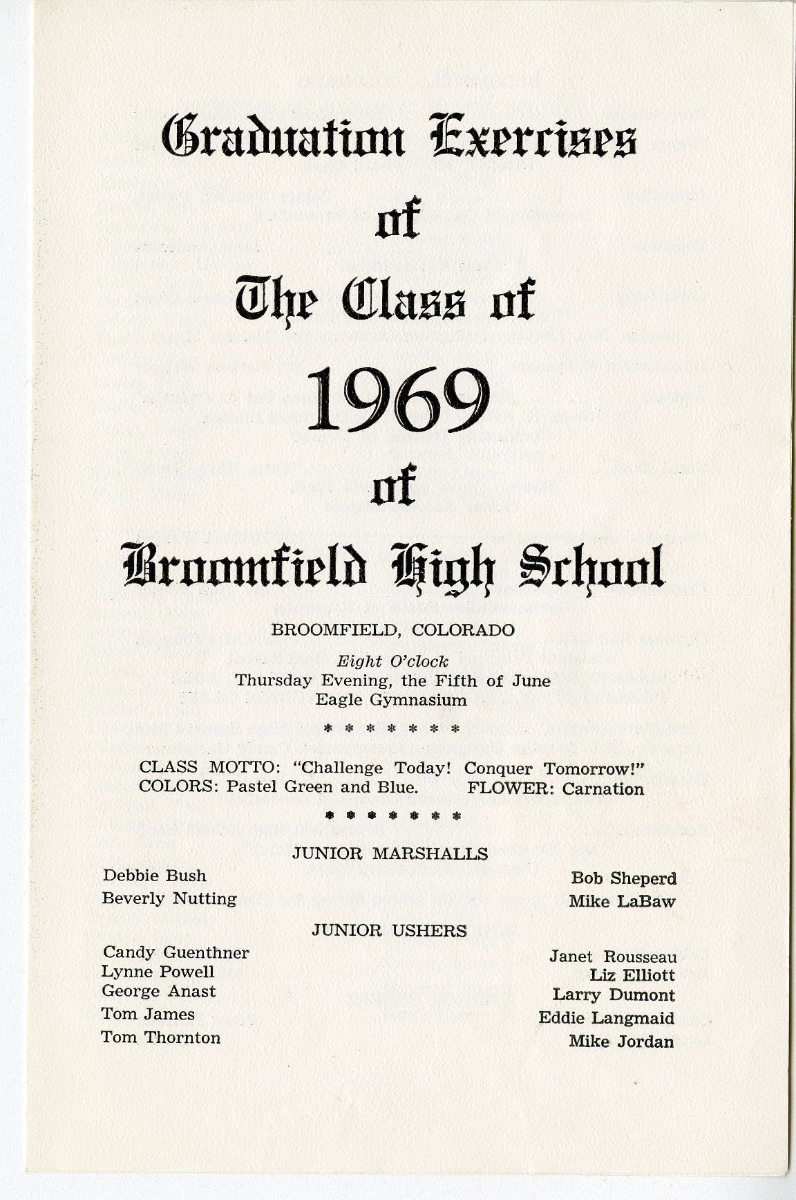 Program for the Graduation Exercises The Class of 1969 of Broomfield High School, held on Thursday, June 5, 1969 at the Eagle Gymnasium. Program outlines speakers, songs, etc. Includes names of Junior Marshalls, Junior Ushers, and Class Roll (including National Honor Society members.Collection