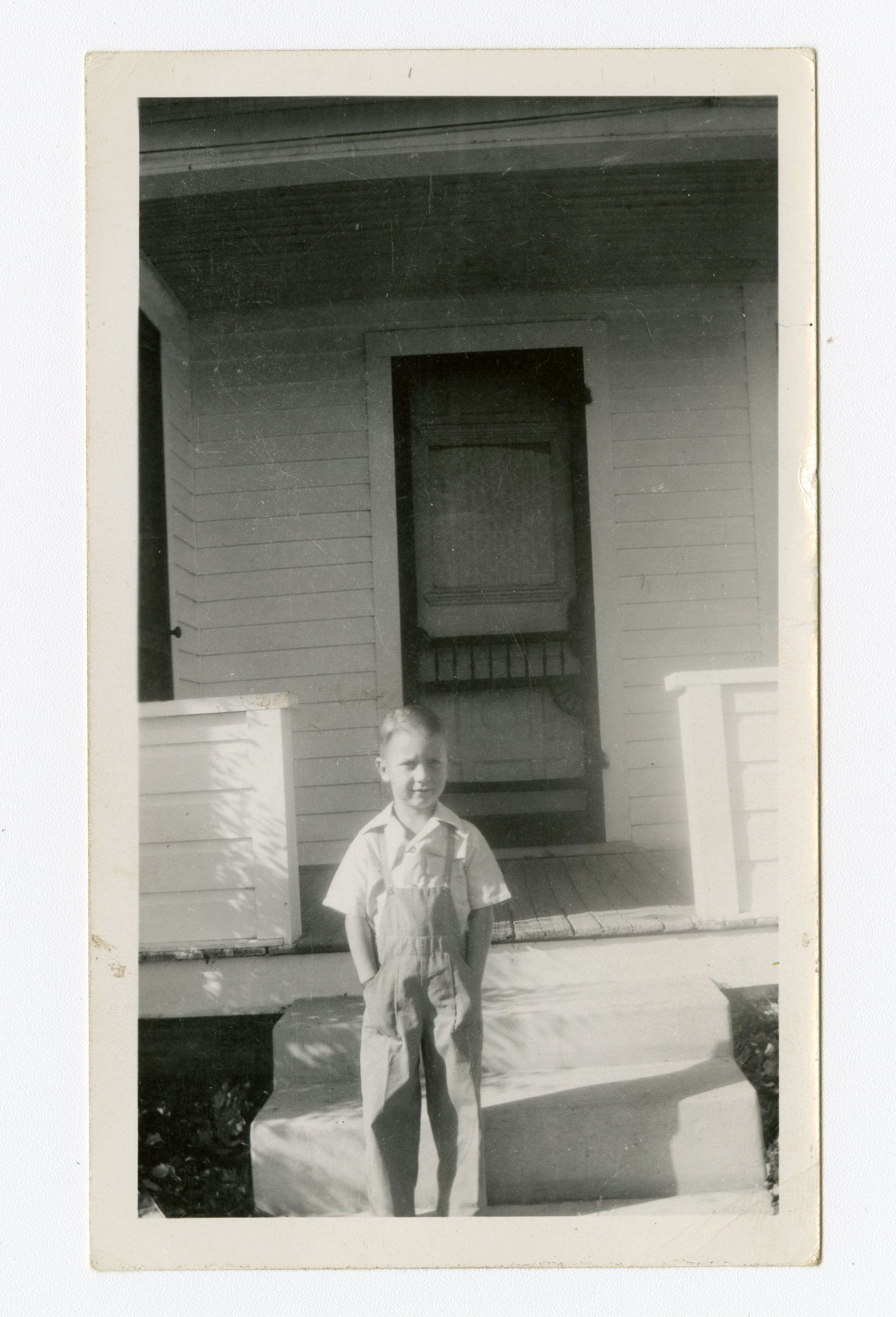 Black and white photograph of a boy standing outside. There is a house in the background. The boy is wearing a white shirt and a pair of overalls. The boy is probably Lester K Brunner.