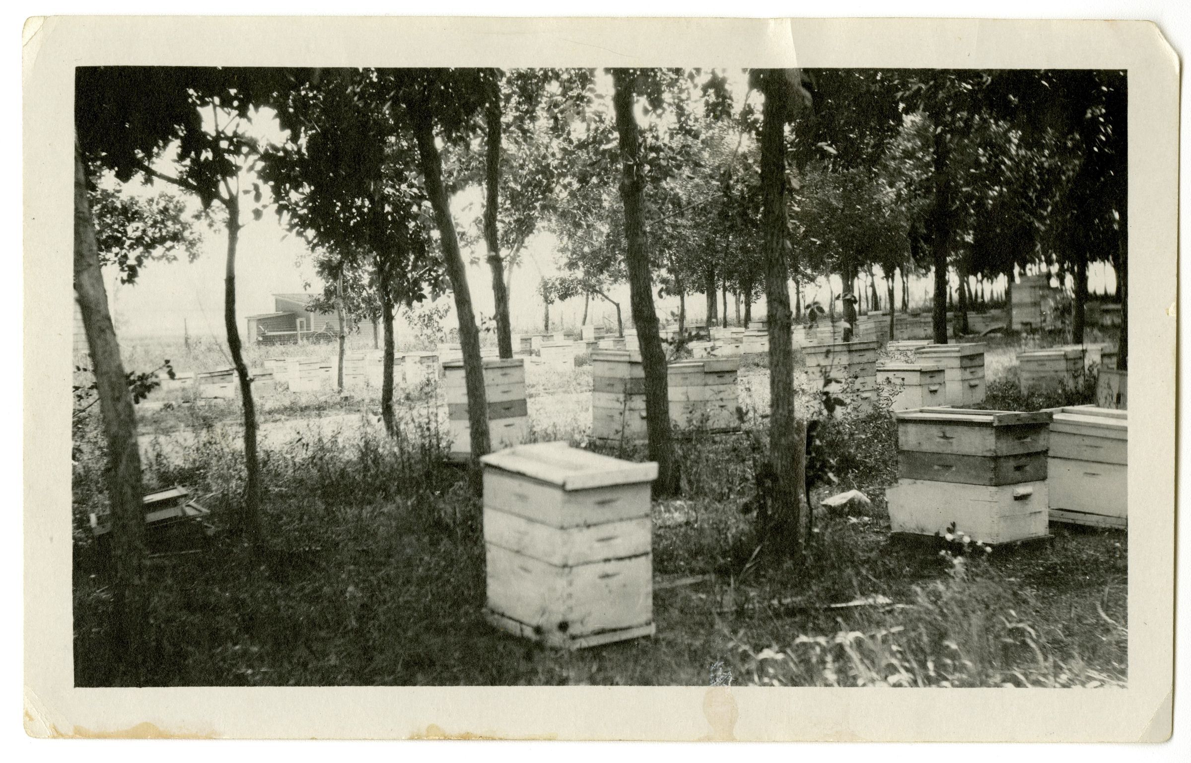 Crawford Honey Bee Boxes with a house in the background. Original.