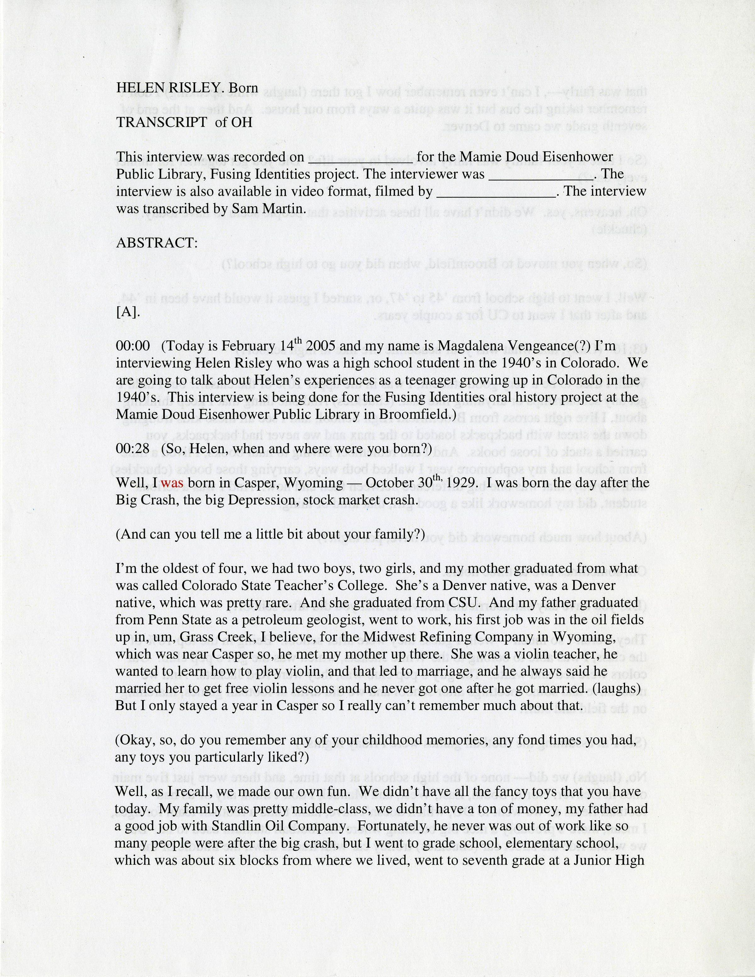 Three full transcripts for oral histories conducted for the "Fusing Identities" project of the Mamie Doud Eisenhower Public Library, 2005. The transcripts are typed, transcribed by Sam Martin, Scott Guile, and Alexander Petit. The interviews were conducted by Magdalena Wegrzyn and Joe Clark. The interviewees were Helen Risley, Robert Law, and Renee Kozisek Sereffe. The interviews were conducted with Broomfielders to get different perspectives on being a teenager in Colorado across multiple generations.Collection
