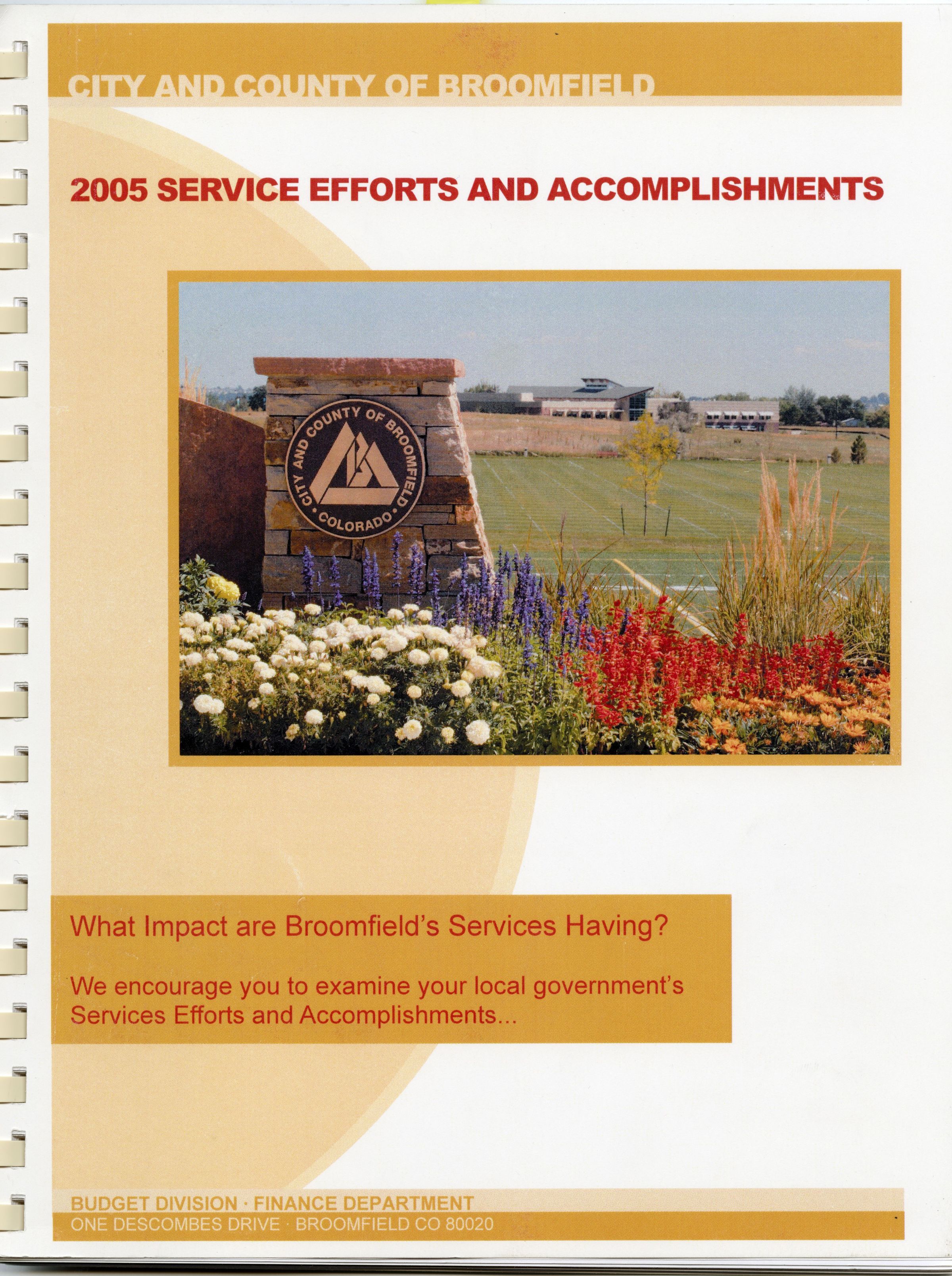 Item is a spiral-bound collection of papers that serves as the Service Efforts and Accomplishments Report from 2005. The cover sheet is yellow and white, and it features a photo of the City and County of Broomfield logo. It also lists the question "What Impact are Broomfield Services Having?" and the sentence "We encourage you to examine your local government's Services Efforts and Accomplishments..." The report was published by the Budget Division of Broomfield's Finance Department. Information about every sphere of the city's services is included in this report: communications, human resources, combined courts, finance, IT, community development, police, public works, community resources, health and human services, and supplemental resources. One section is marked by a yellow sticky tab.Collection