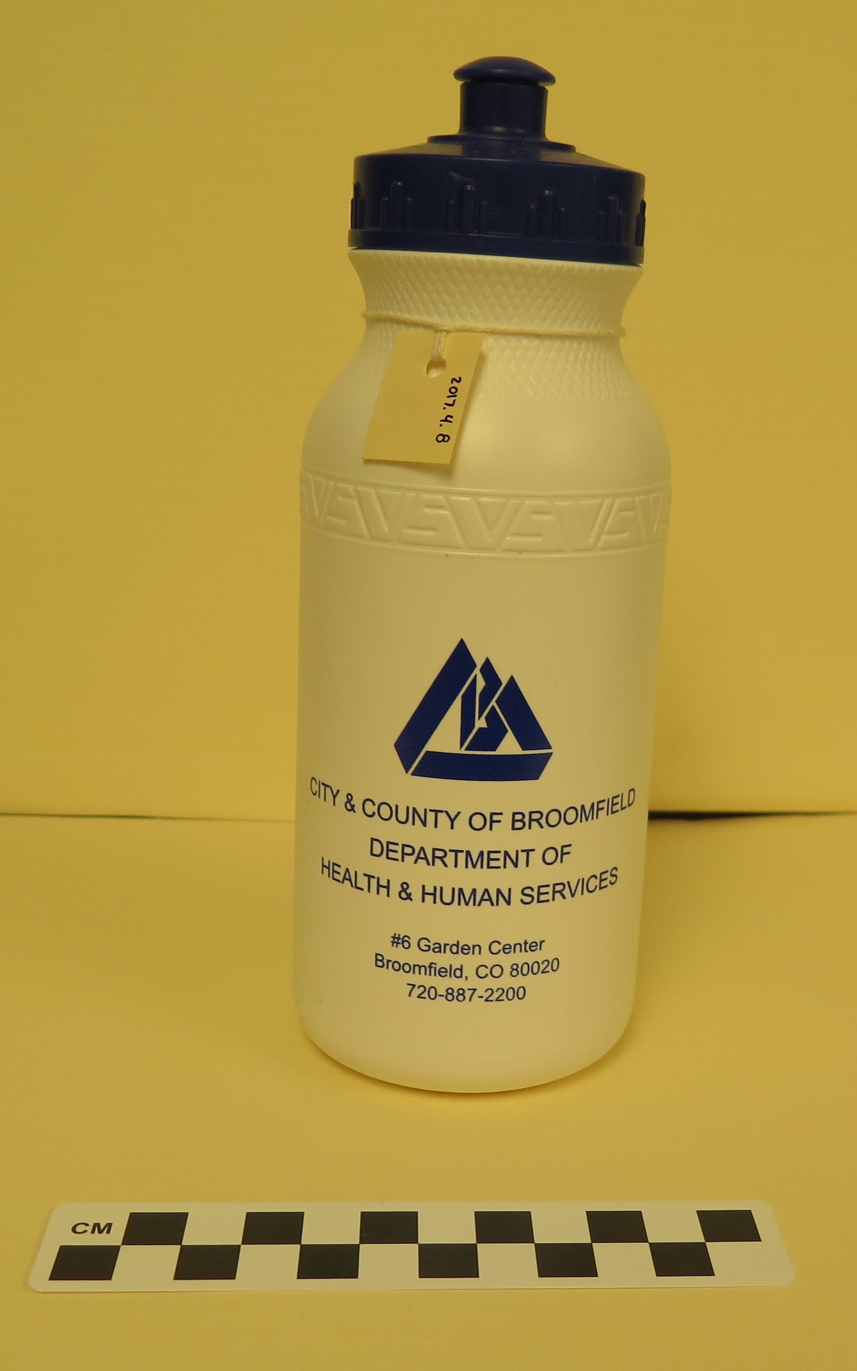 This is a white water bottle with a blue lid. The water bottle has text on the side that reads, "City & County of Broomfield/ Department of/ Health & Human Services/ #6 Garden Center/ Broomfield, CO 80020/ 720-887-2200". Also on the side is the City and County of Broomfield logo. The water bottle measures 8" (h) x 3.5" (dia).