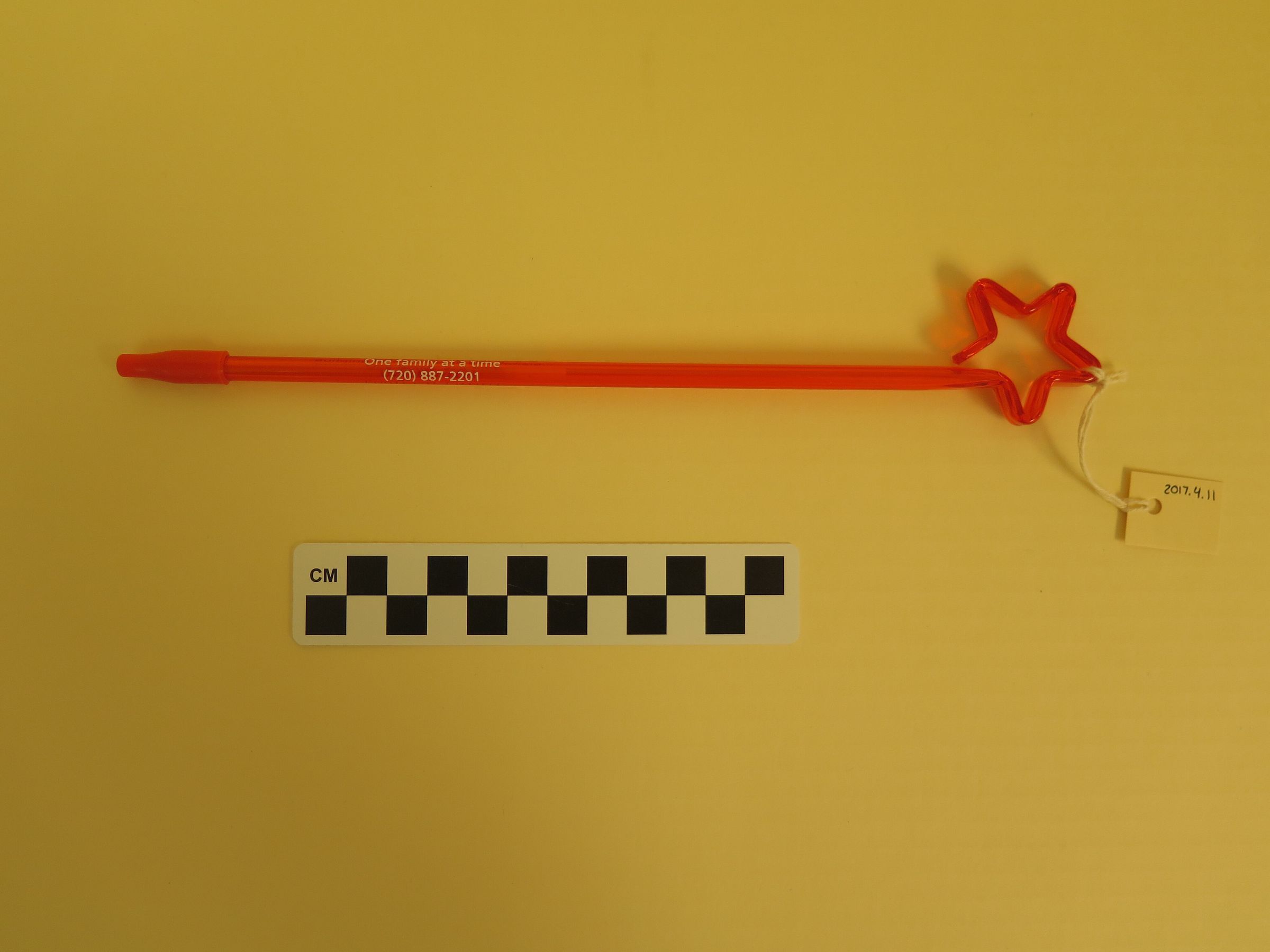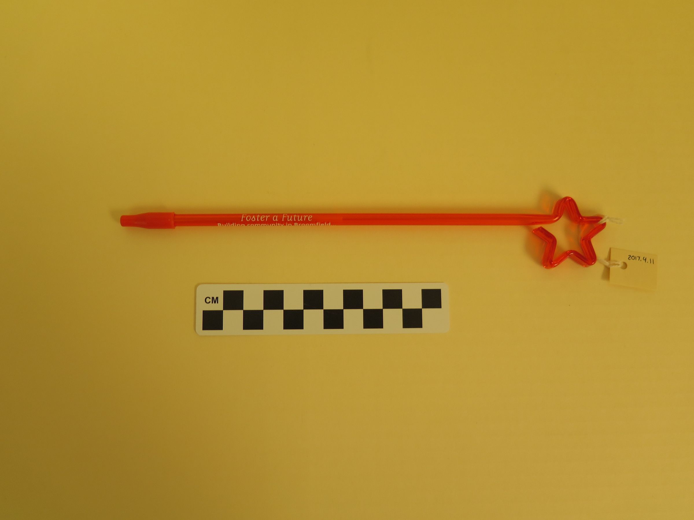 This is an orange plastic pen with a cap. The pen has a star shape at the end. The pen has white text on the side that reads, "Foster a Future/ Building community in Broomfield/ One family at a time/ (720) 887-2201". The pen measures 1.5" (w) x 9.75" (l).