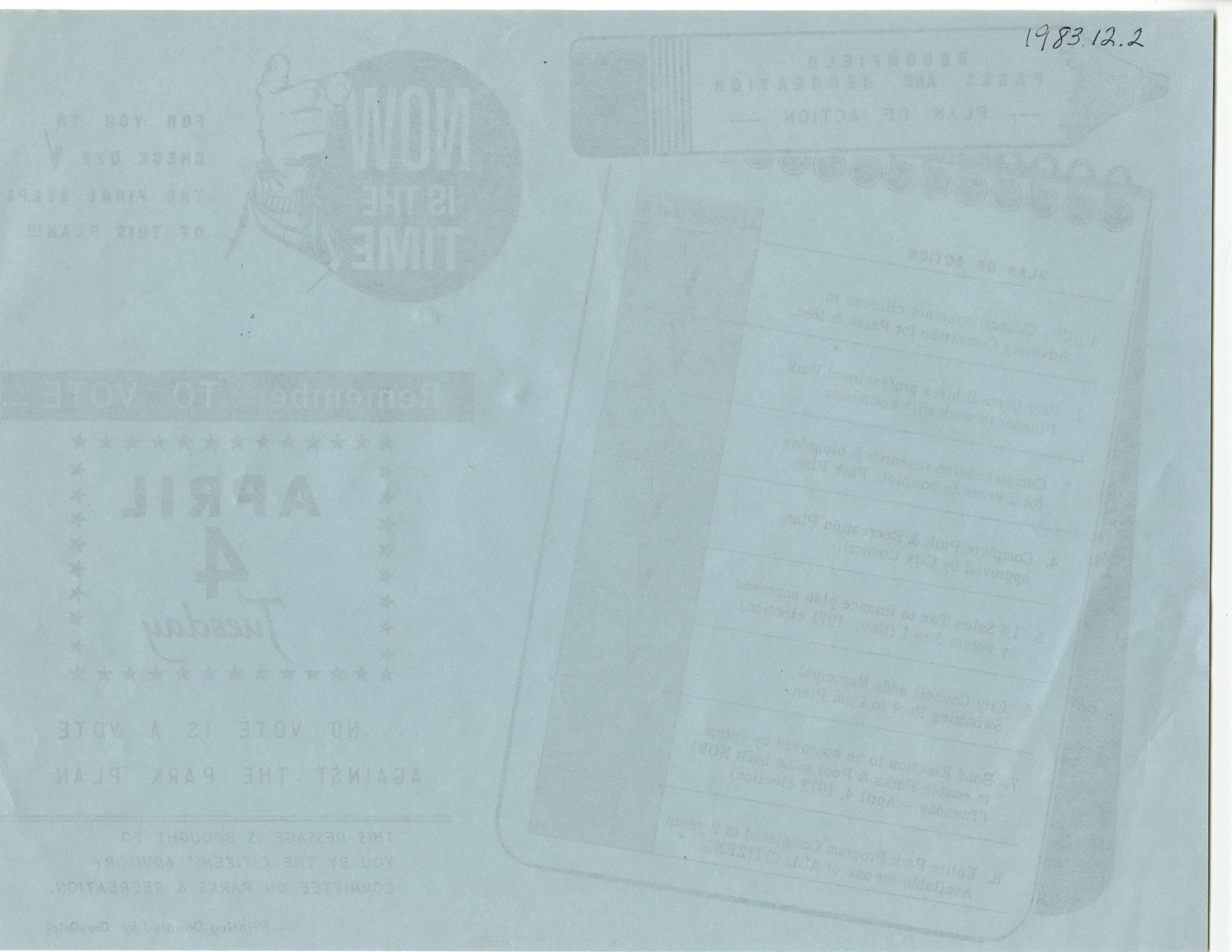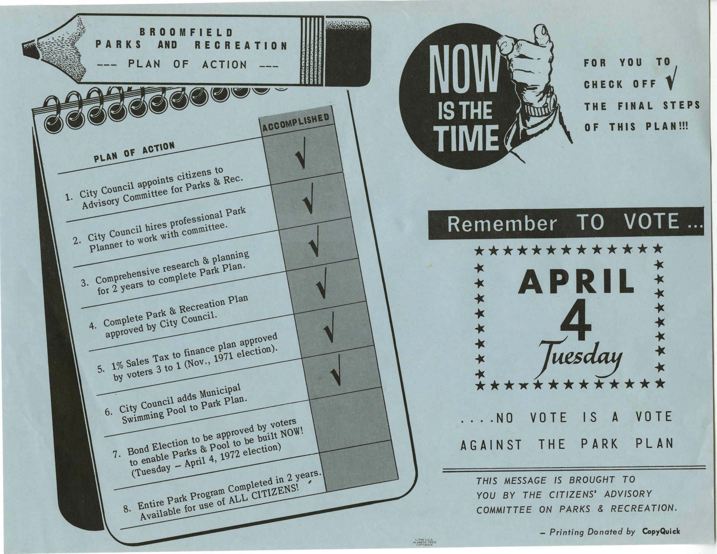 park bond election flyers (4) Only one flier 5/2/18 - Flier is blue and has printed at the top "Broomfield Parks and Recreation -----Plan of Action ------- / Now is the Time for you to check off the final steps of this plan!!!"