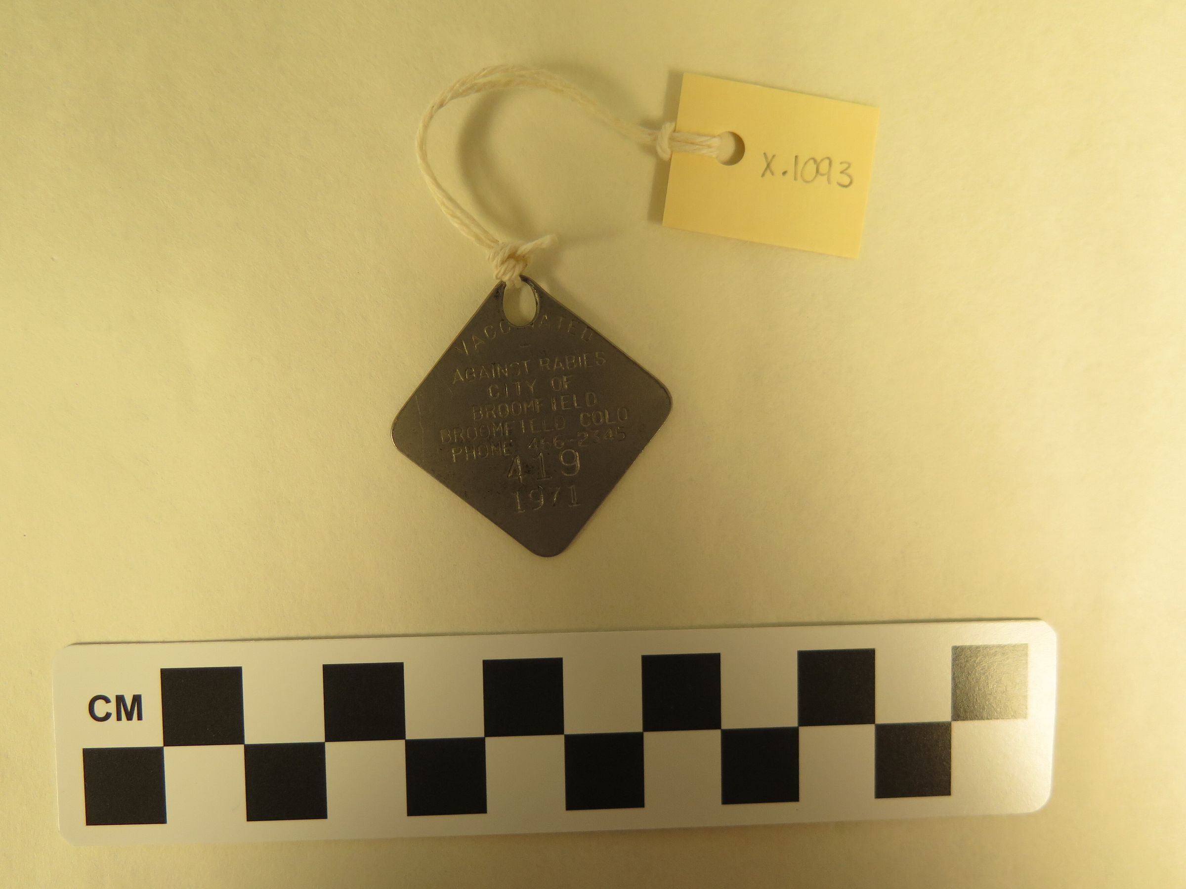 This is a diamond-shaped metal animal tag indicating that a dog received a rabies vaccination in 1971 in Broomfield. The text on the tag reads, "Vaccinated/ Against Rabies/ City of/ Broomfield/ Broomfield Colo/ Phone 466-2345/ 419/ 1971". The tag measures 1.5" (w) x 1.5" (l).