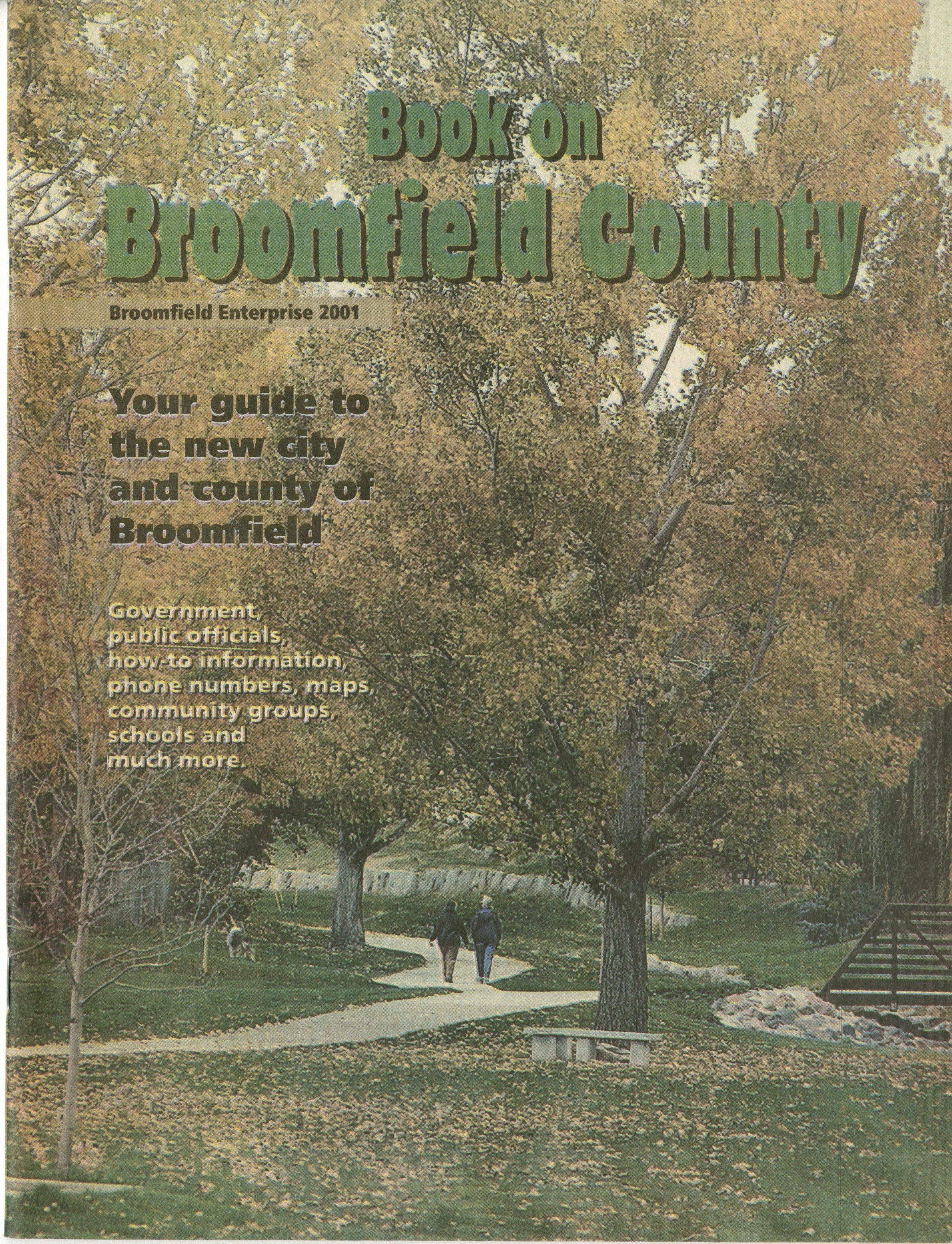 A copy of the "Book on Broomfield County" from 2001. It was published by the Broomfield Enterprise. Sections include Broomfield History, a Council Ward Map, City Services, a New City/County Boundaries Map, and a How to section.Publication Details