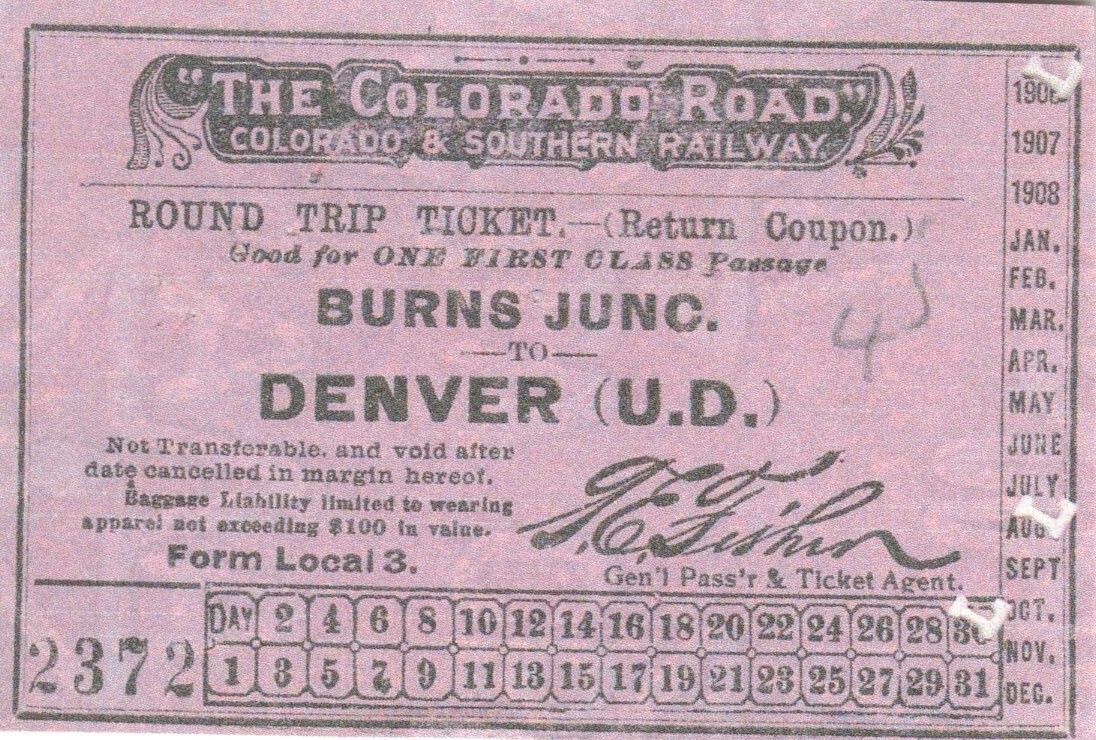 Replica of a C&S Railway round trip ticket from Burns Junction to Denver Dimensions (approximate): 3 3/4" x 2 1/2"