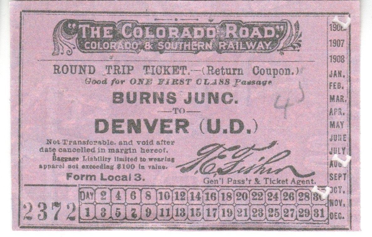 Replica of a C&S Railway round trip ticket from Burns Junction to Denver Dimensions (approximate): 3 3/4" x 2 1/2"