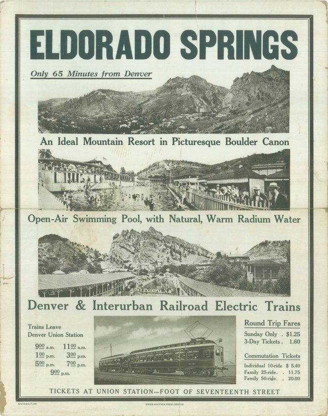 Original poster for Denver & Interurban Railroad train trips to Eldorado Springs, Colorado, 1917. The poster has "Eldorado Springs" displayed prominently at the top, with pictures of mountain scenery, hot springs, resort buildings, and a Denver & Interurban electric train below it. Captions on the poster read,