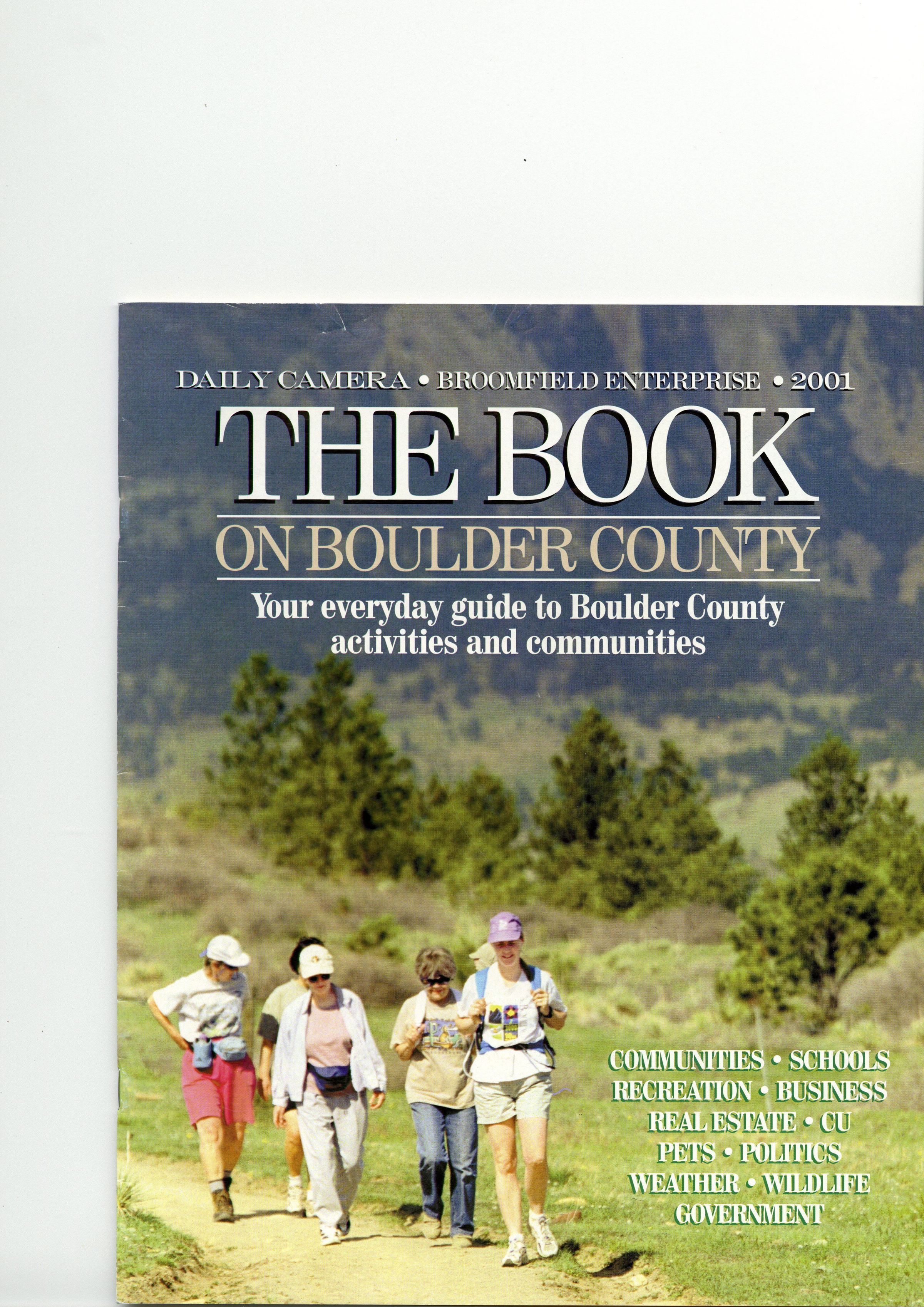 A copy of "The Book on Boulder County" from 2001. It is described as "Your everyday guide to Boulder County activities and communities." It was published by the Daily Camera and the Broomfield Enterprise. Articles include "Transportation," "Pets," "Culture and Science," and "Newcomers' groups." Also included are sections on communities in Boulder County and Contacts.Publication Details