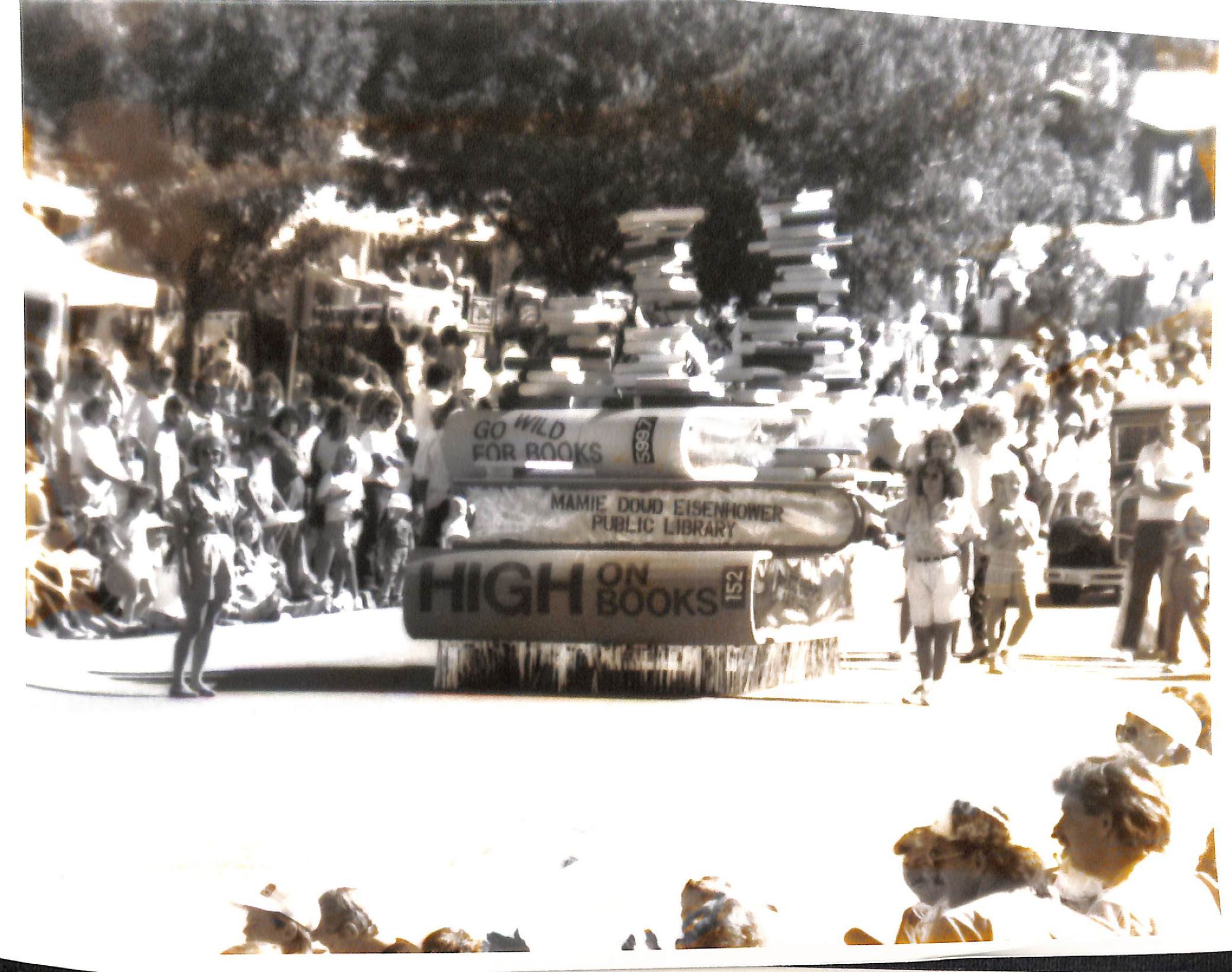 Item is a photograph printed on Kodak paper taken during the 1989 Broomfield Days event. The photo centers around the parade, specifically the Mamie Doud Eisenhower Public Library float, which was constructed to look like a stack of giant books. The spine of the lowest book reads "High on Books," and the third biggest reads "Go Wild for Books." Crowds have gathered along both sides of the street to view the float, which was designed by Terry Barnhart and Chuck Mead. Tall trees frame the background of the photo.Photograph Details