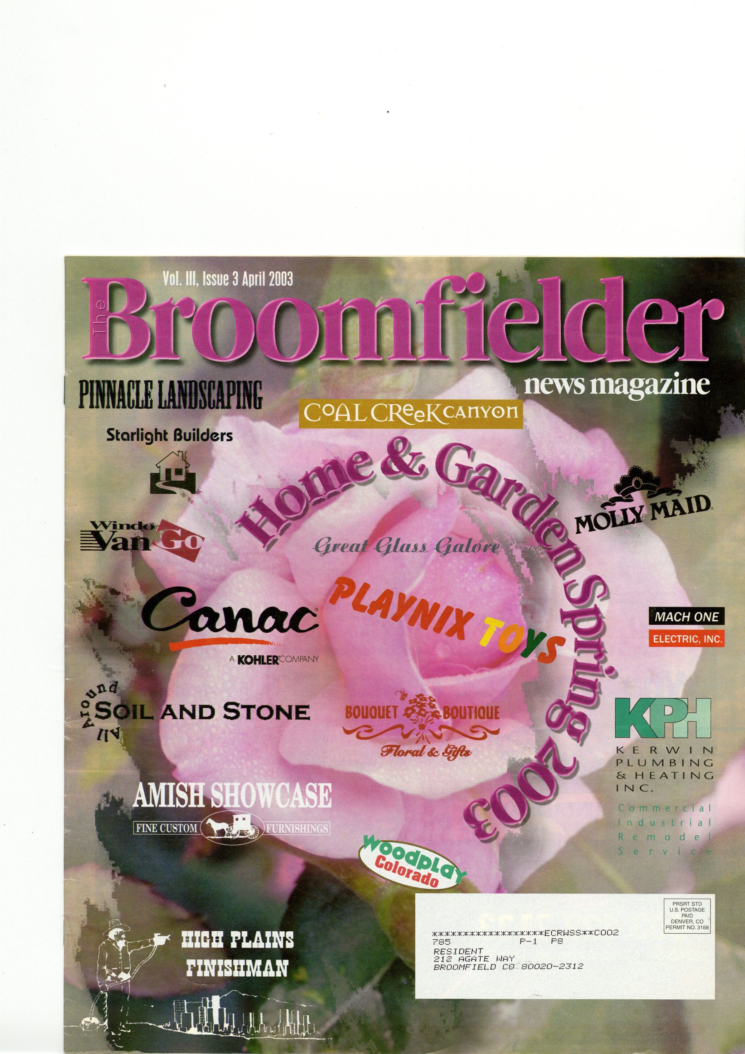 A copy of "The Broomfielder News Magazine" volume 3 issue 3 from April 2003. Articles include "New Rec Center Has Something for Everyone," "Is Computer Training for You," and "Phase of of 'Chateaux' Office Center Gets Underway."Publication Details