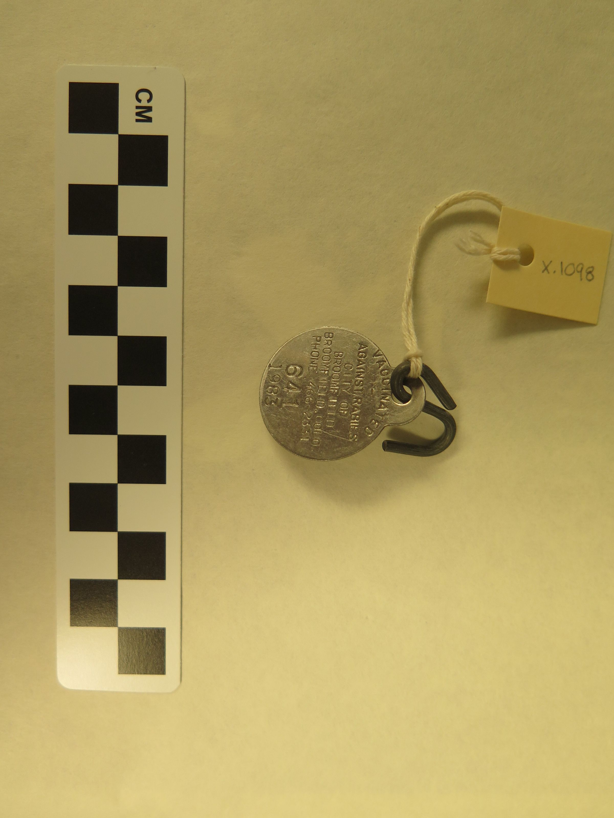 This is a round metal animal tag indicating that a dog received a rabies vaccination in 1983 in Broomfield. The text on the tag reads, "Vaccinated/ Against Rabies/ City of/ Broomfield/ Broomfield, Colo./ Phone 466-2331/ 641/ 1983". The tag measures 1" (dia).