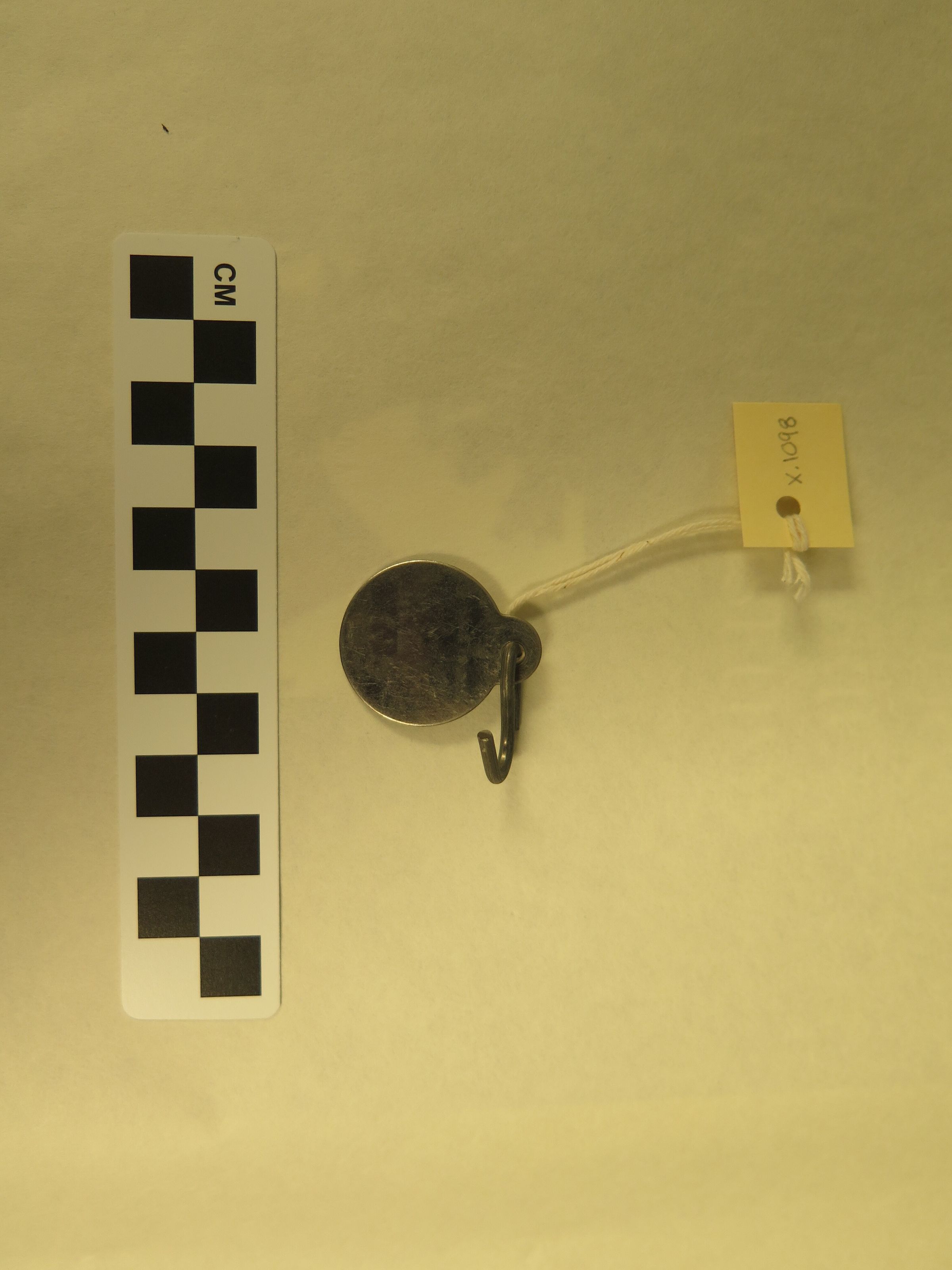 Front of tag.: Origsize: 1" (dia); Origformat: Artifact