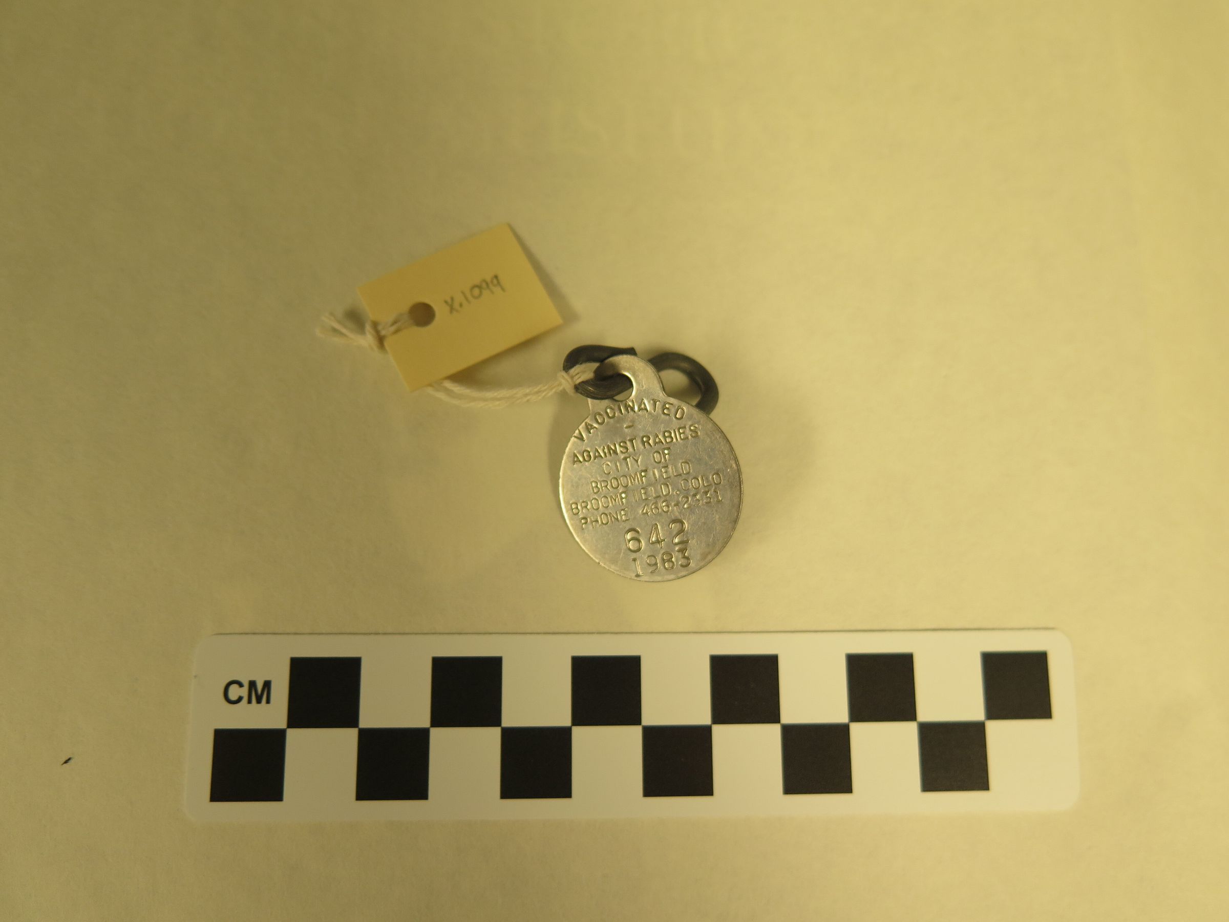 This is a round metal animal tag indicating that a dog received a rabies vaccination in 1983 in Broomfield. The text on the tag reads, "Vaccinated/ Against Rabies/ City of/ Broomfield/ Broomfield, Colo./ Phone 466-2331/ 642/ 1983". The tag measures 1" (dia).