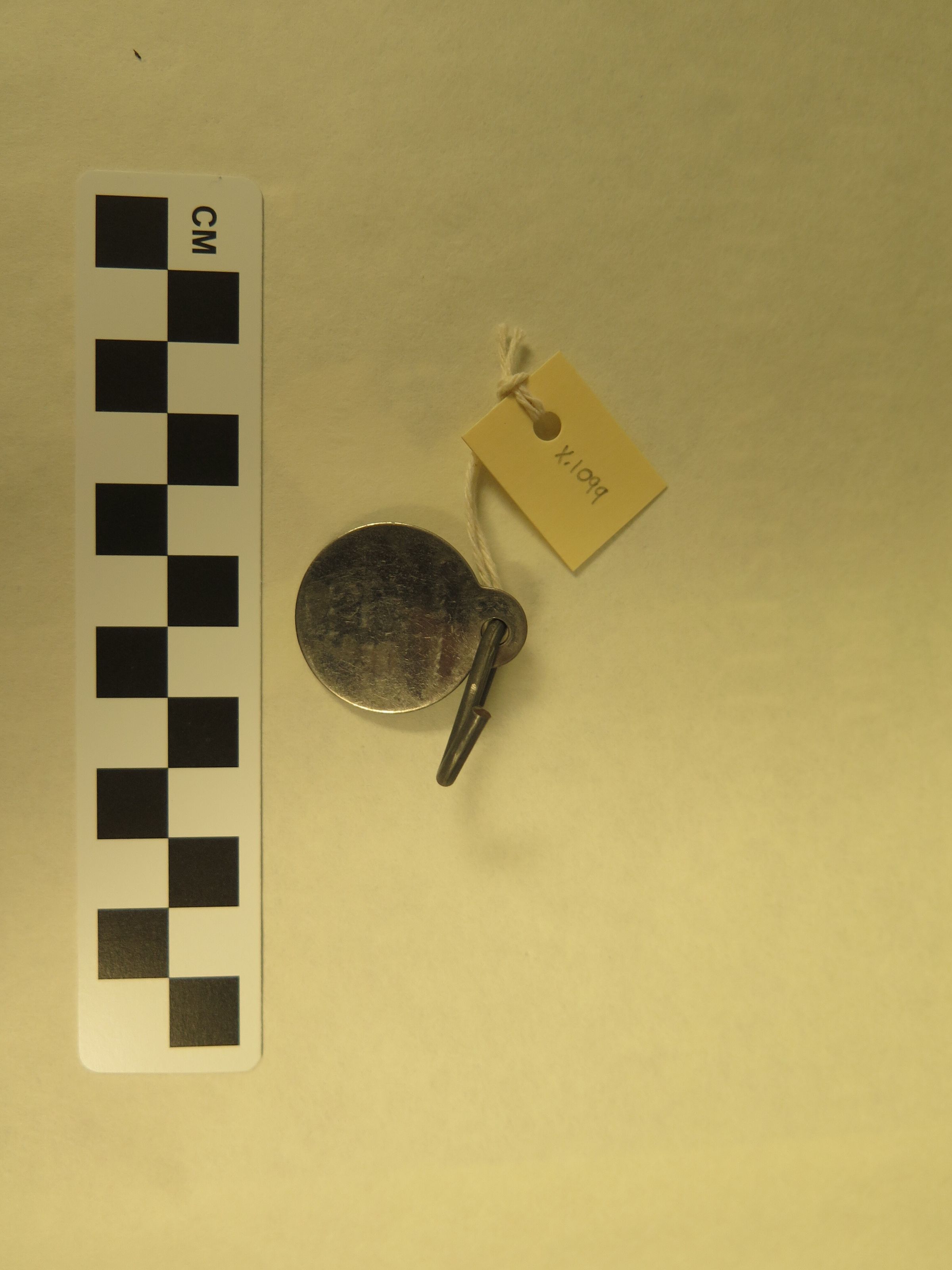 Front of tag.: Origsize: 1" (dia); Origformat: Artifact