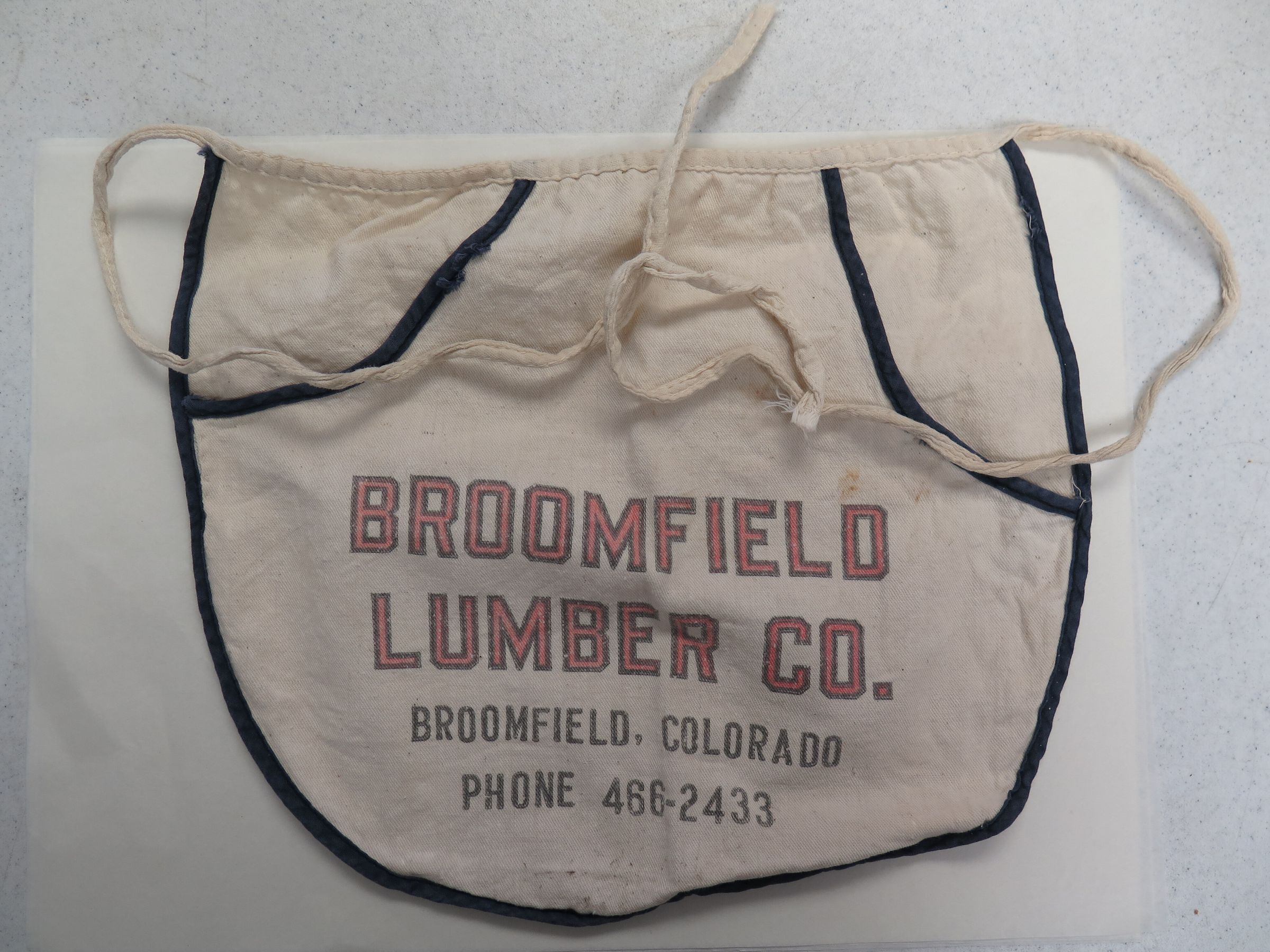 This is a Broomfield Lumber Co. apron. The apron is white with blue trim and 2 pockets. The apron has text on the front that reads, "Broomfield/ Lumber Co./ Broomfield, Colorado/ Phone 466-2433". The apron measures 12" (h) x 14" (w).Collection