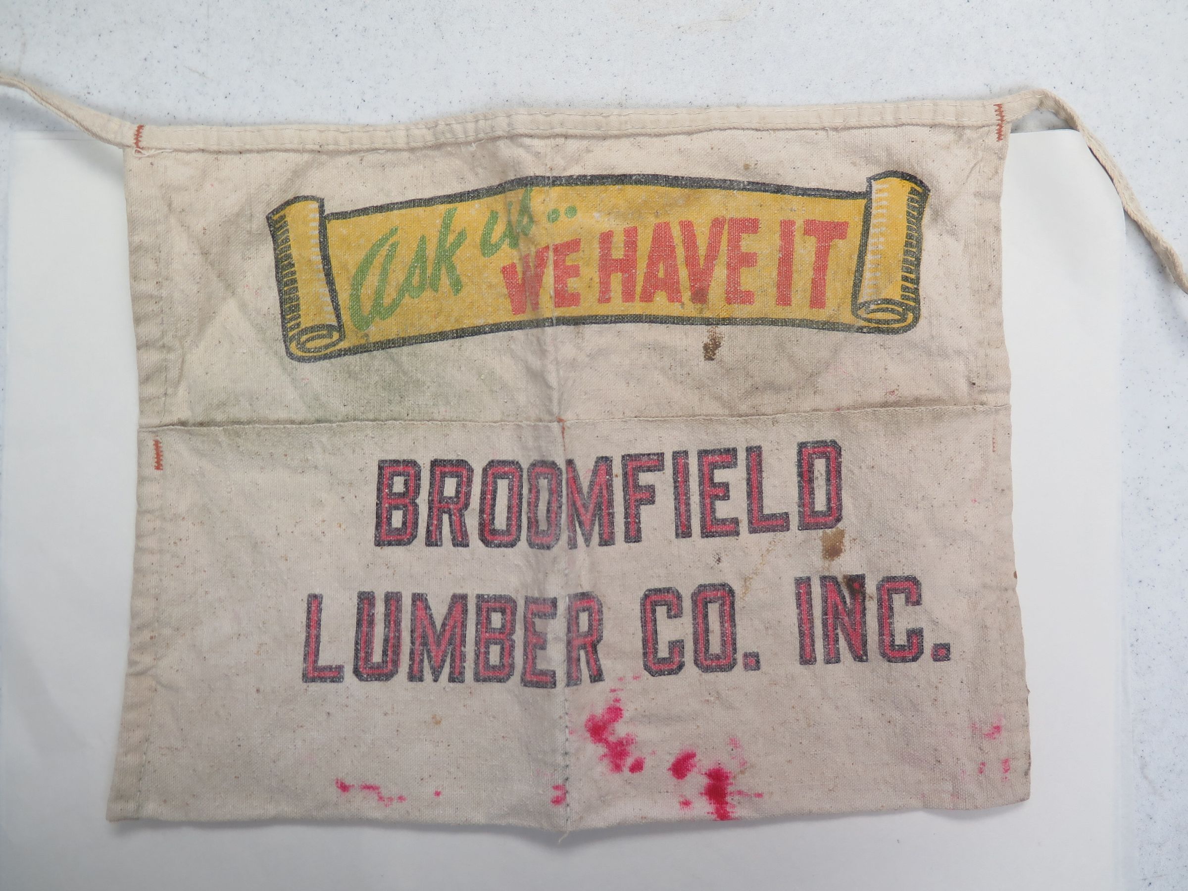 This is a white Broomfield Lumber Co. apron with a string that ties in the back and 2 pockets on the front. The text on the front of the apron reads, "Ask Us... We have it!/ Broomfield/ Lumber Co. Inc."The apron measures 10.5" (h) x 13.5" (w).Collection