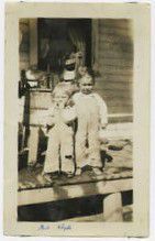 Black and white photograph of two boys wearing overalls standing on a porch. Behind them is a workbench. The viewer can see a window with curtains in the background. The boys are identified as Gib and Clyde.