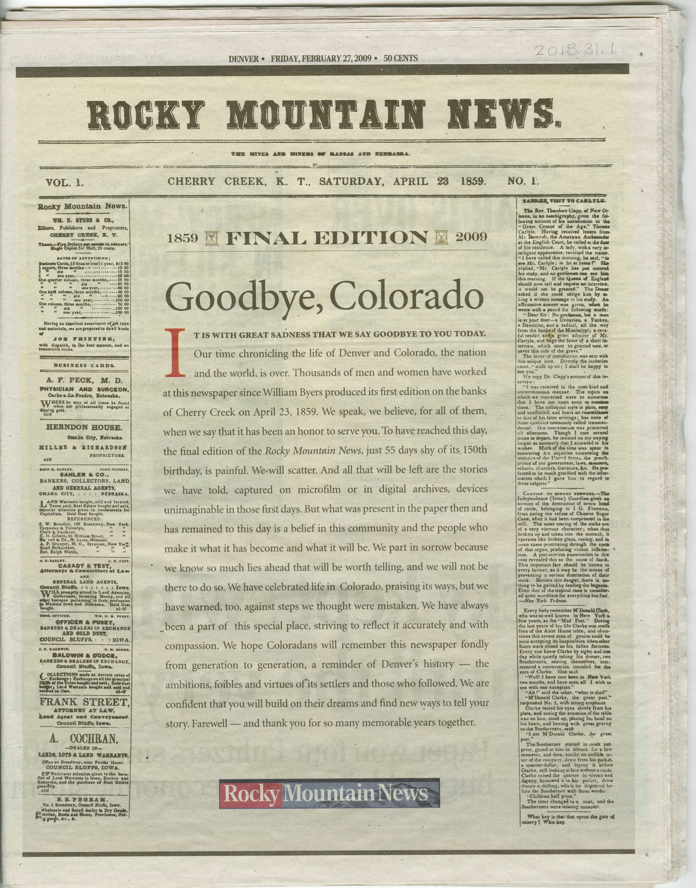Final edition of the Rocky Mountain News. Front page article: "Goodbye, Colorado".