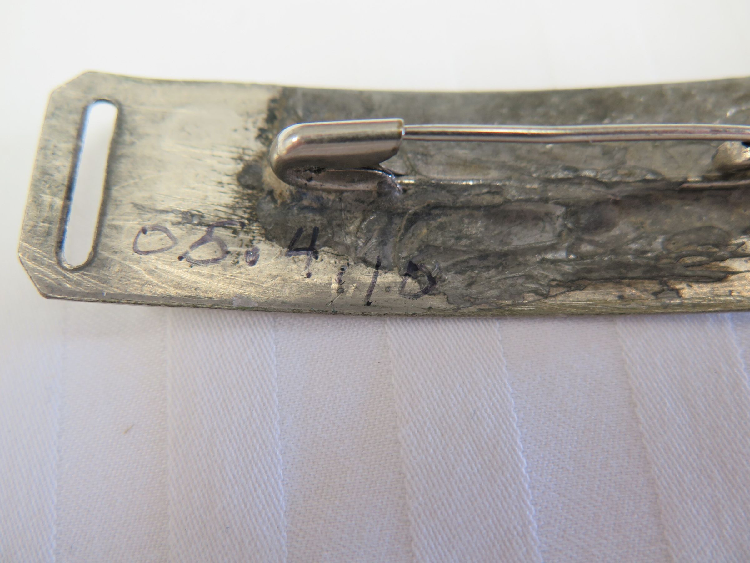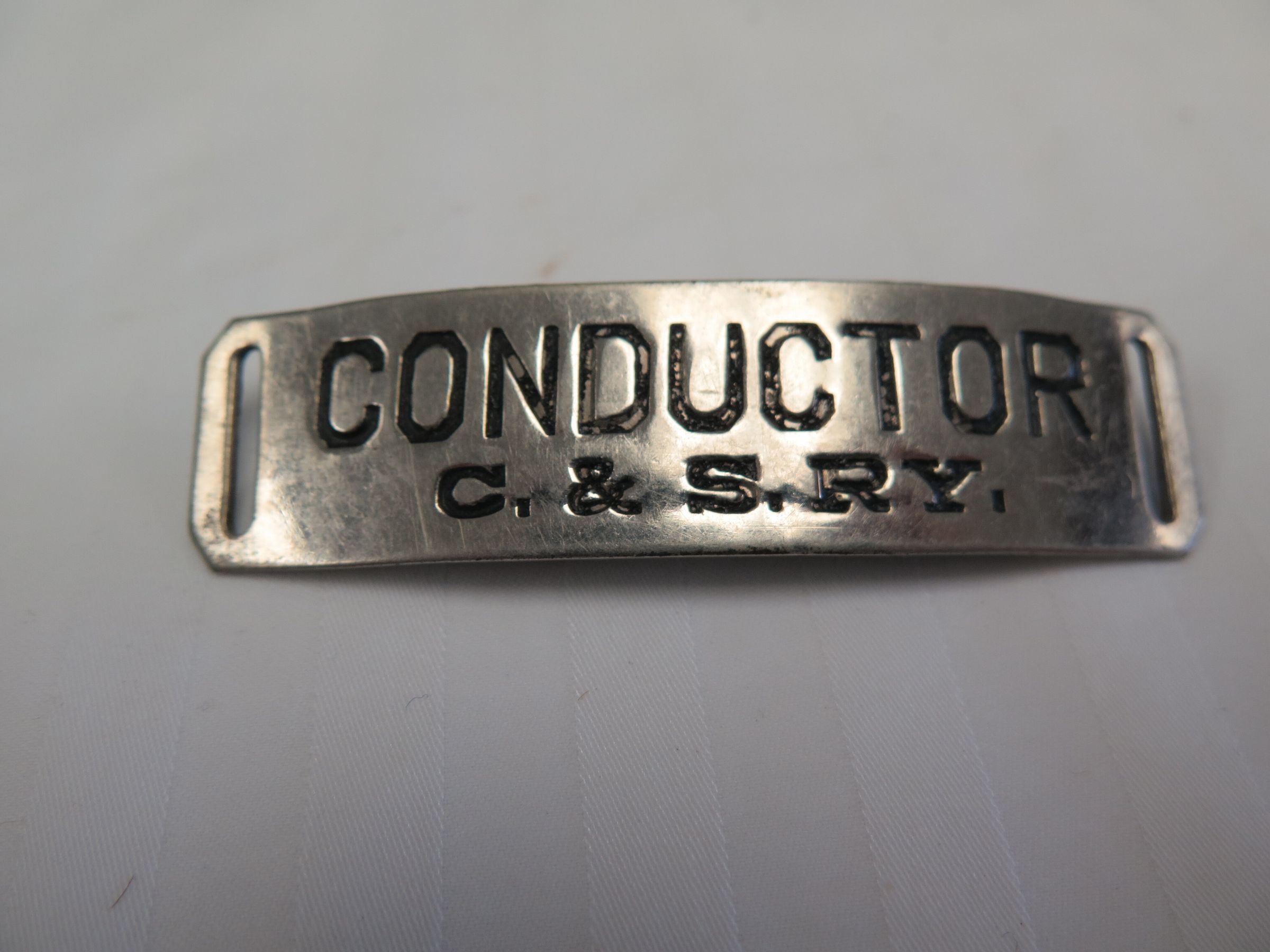 This is a metal hat badge that has been moditied to have a safety pin closure on the back. The front of the hat badge has text that reads, "CONDUCTOR/ C. & S. RY." The badge measures 0.75" (w) x 3" (l).
