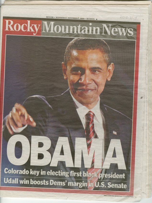 Rocky Mountain News newspaper with President Obama on the cover and caption "Colorado key in electing first black president".