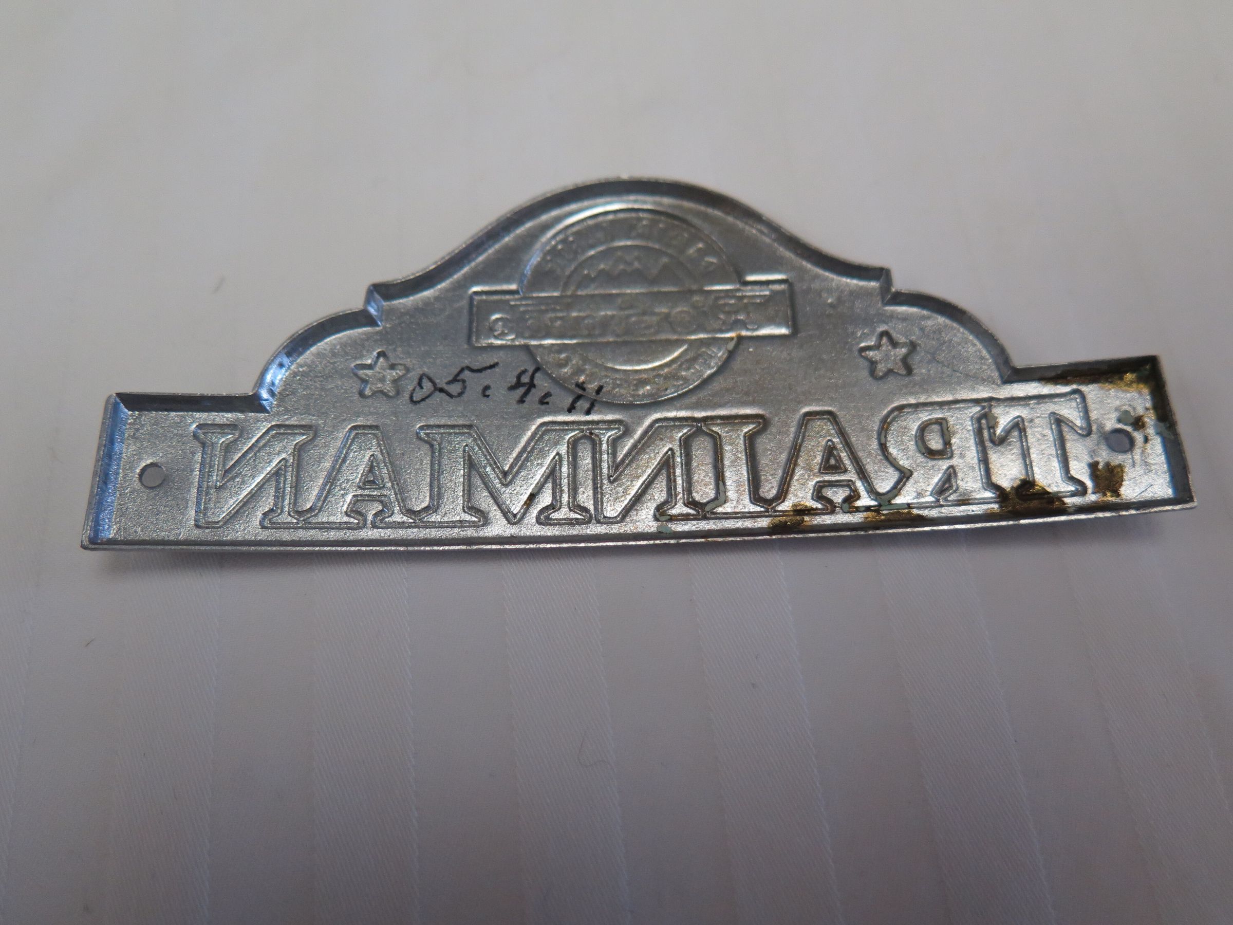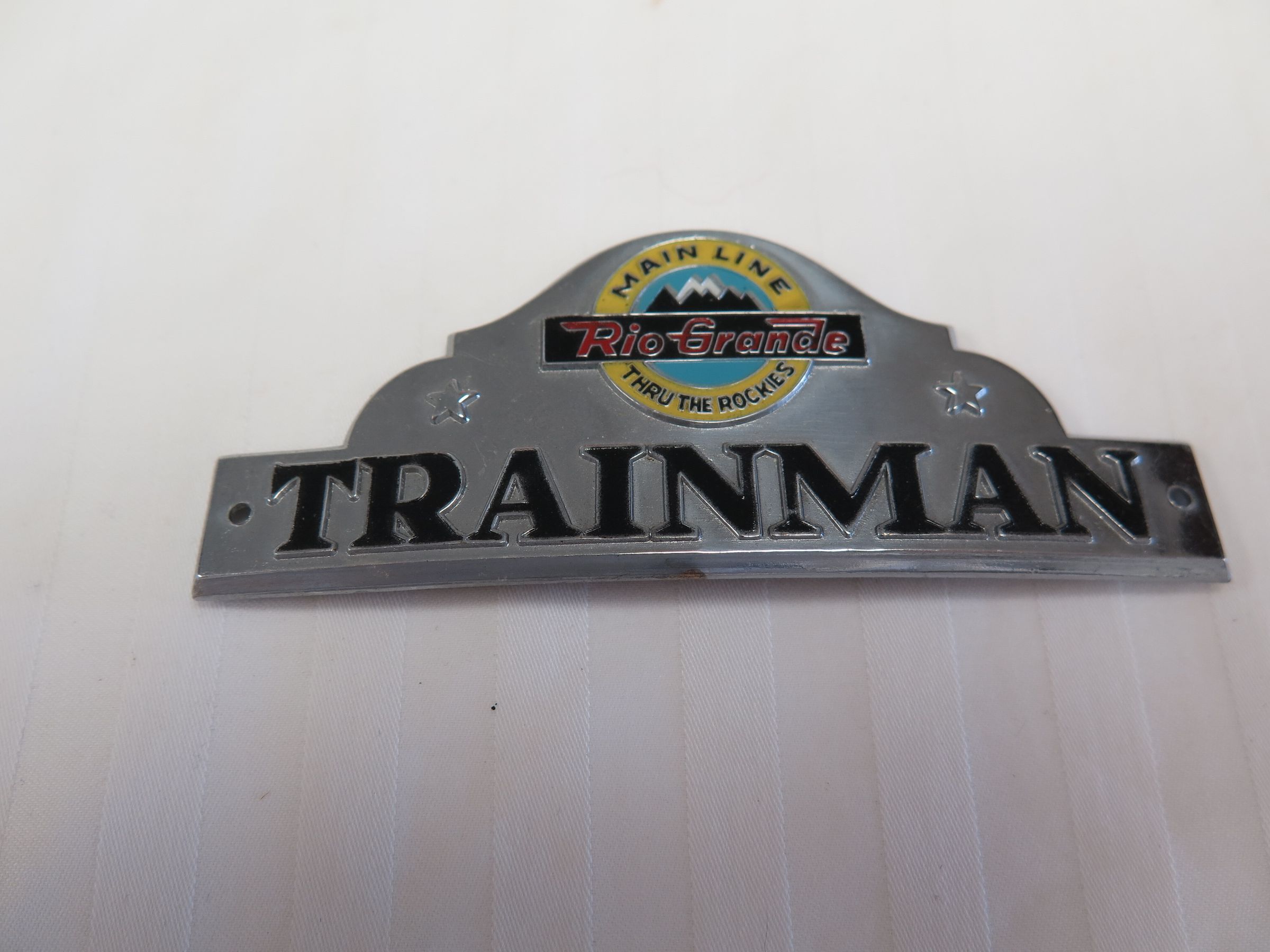 This is a metal hat badge for the Rio Grande RR. The badge has black text on the front that reads, "TRAINMAN". Also on the front is the logo for the Rio Grande Main Line. The badge does not have a pin closure on the back. It has two holes on the front where it could have been attached to a hat. The badge measures 1.5" (h) x 4" (l).Collection
