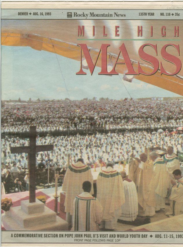 Rocky Mountain News covering Pope John Paul II's visit to Denver. Front page caption "Mile High Mass".