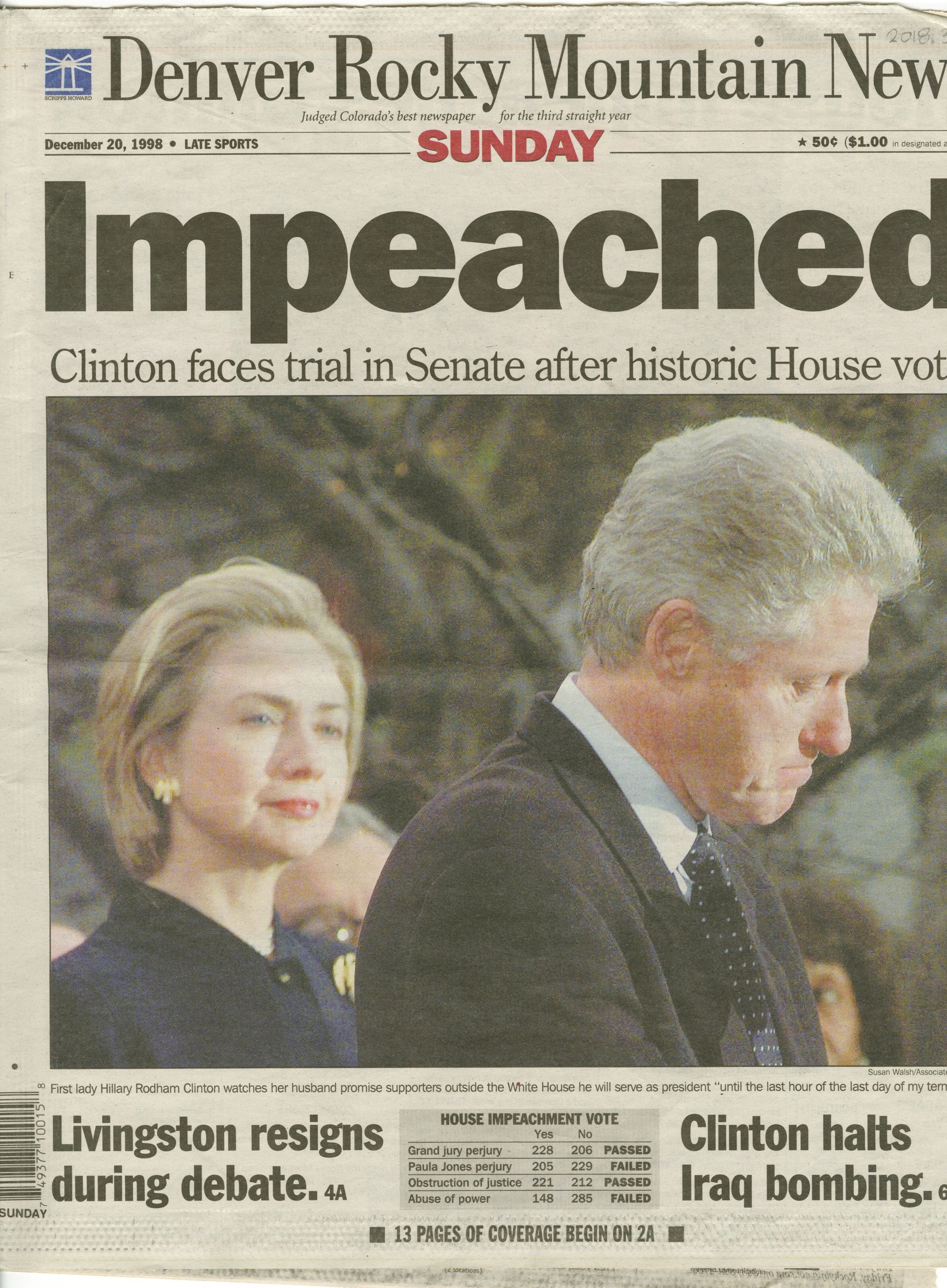 Denver Rocky Mountain News covering Bill Clinton's impeachment. Front page caption "Impeached Clinton faces trial in Senate after historic House vote".Collection