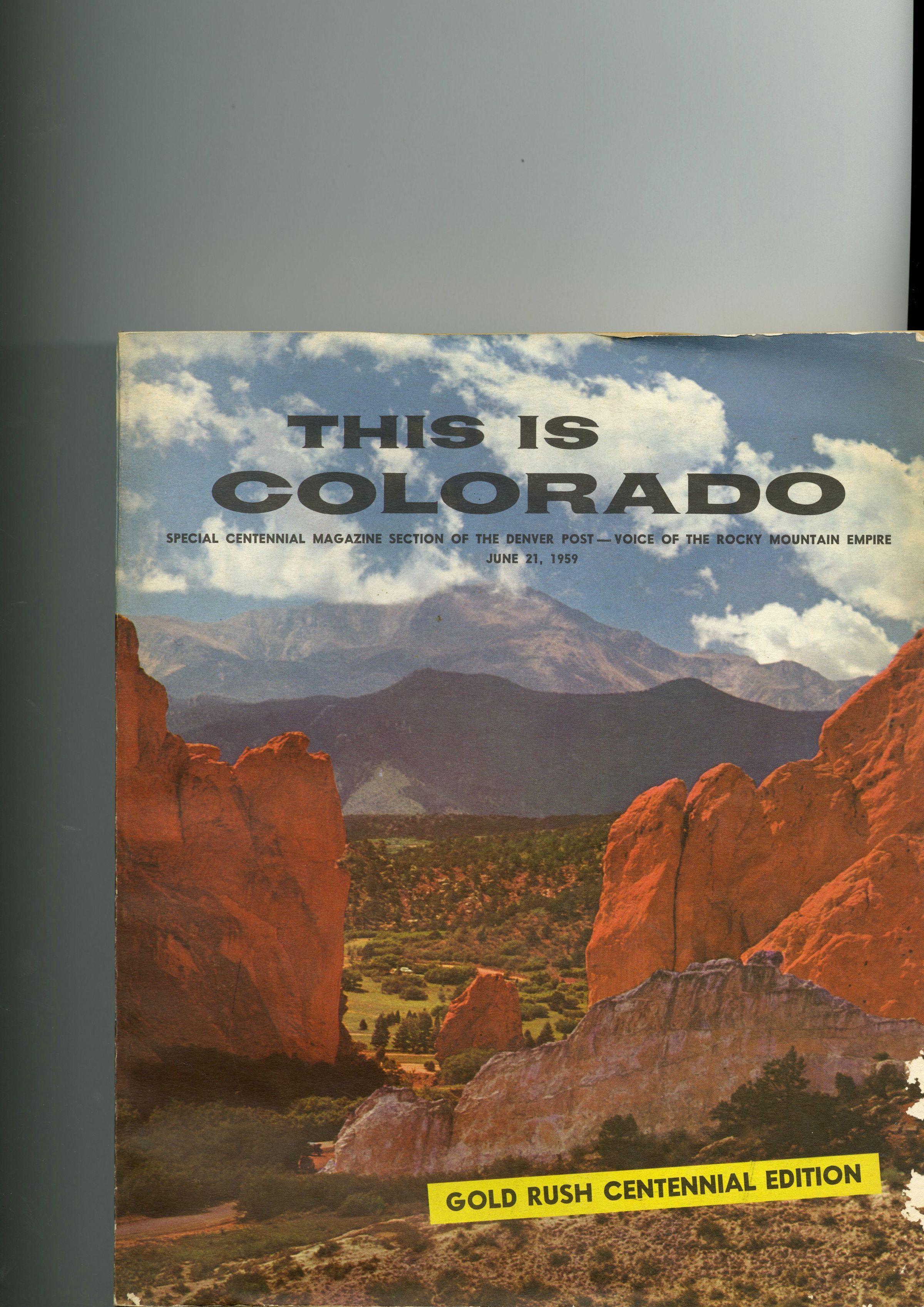 A copy of "This is Colorado." It is a special centennial magazine section of the Denver Post and Voice of the Rocky Mountain Empire. It was published June 21, 1959. Contents include "Colorado's First 100 Years," "Calendar of Events," " Forecast for the Future," and "Pictures of the Past."Publication Details