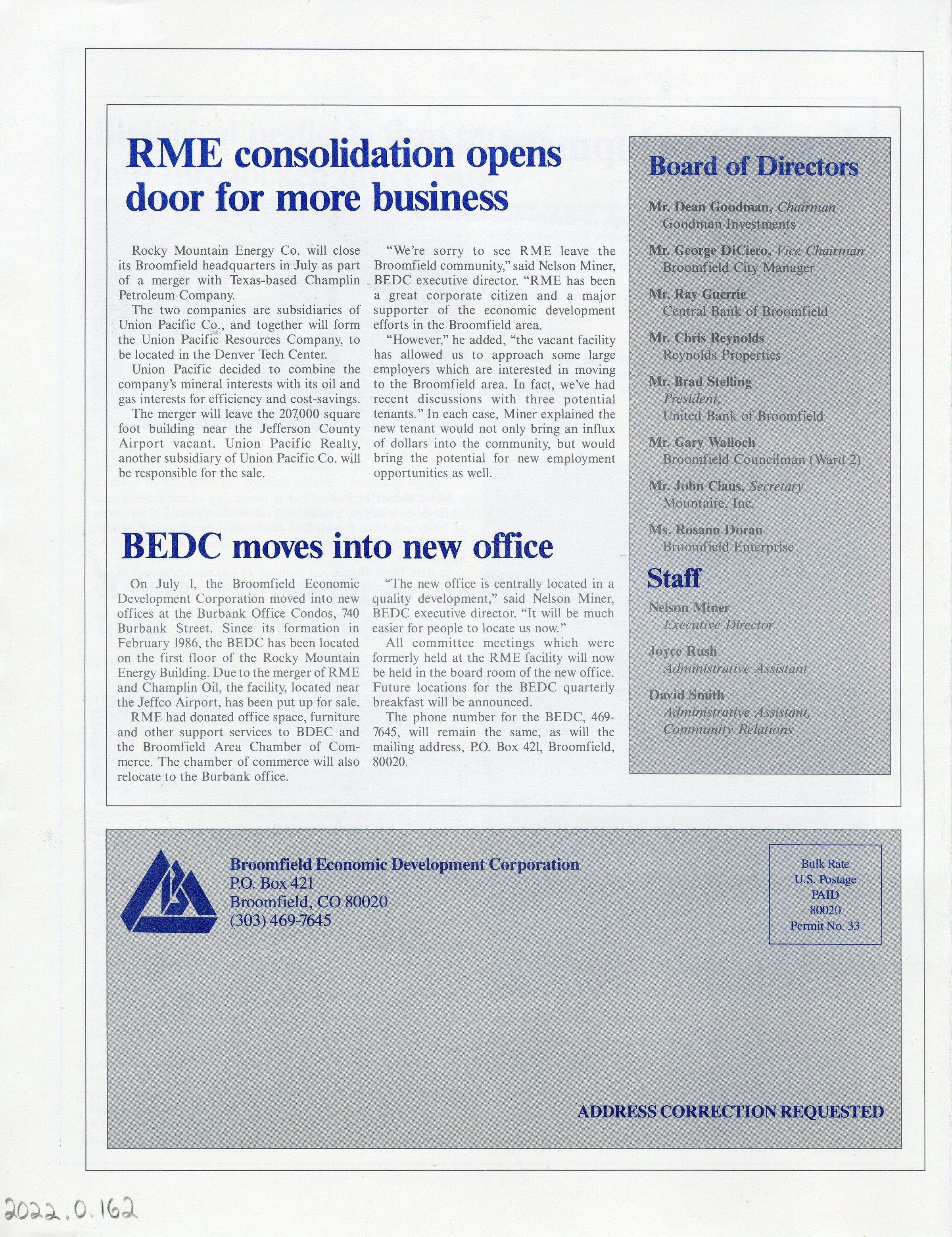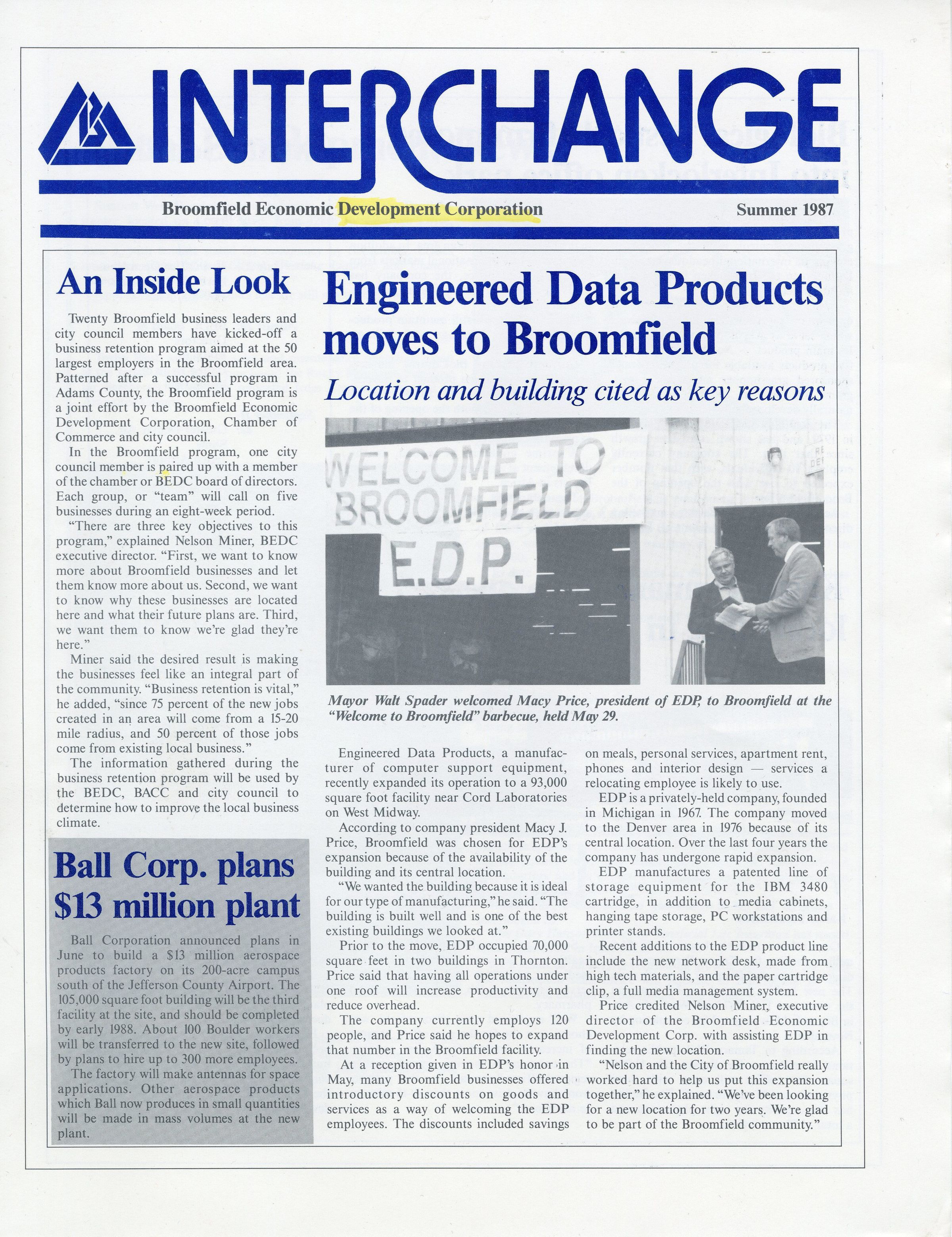 Broomfield Economic Development newsletter the Interchange, Summer 1987. 4 pages (single 11x17 sheet folded once).