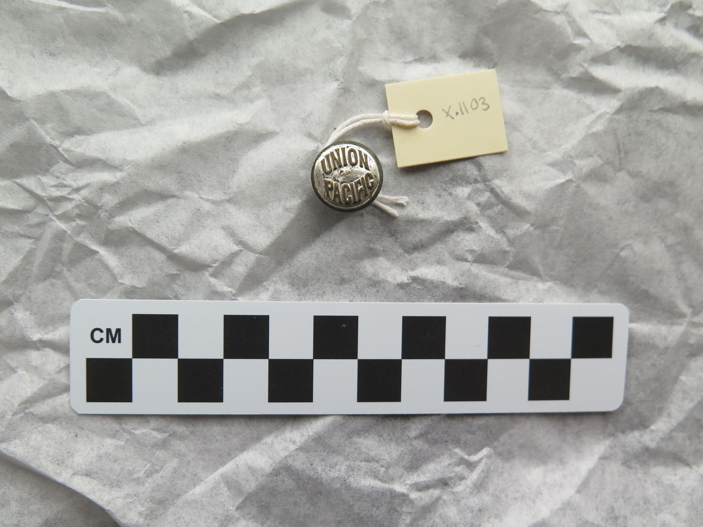 This is a metal button from a Union Pacific employee uniform. The button has a metal lopp on the back where it could be attached to the garment. The front of the button has the text, "Union Pacific". The back of the button has the text, "S. A. French/ New York" around the edge. S. A. French refers to Samuel A. French & Company, New York City, 1893-1928. The button measures 0.5" (dia).