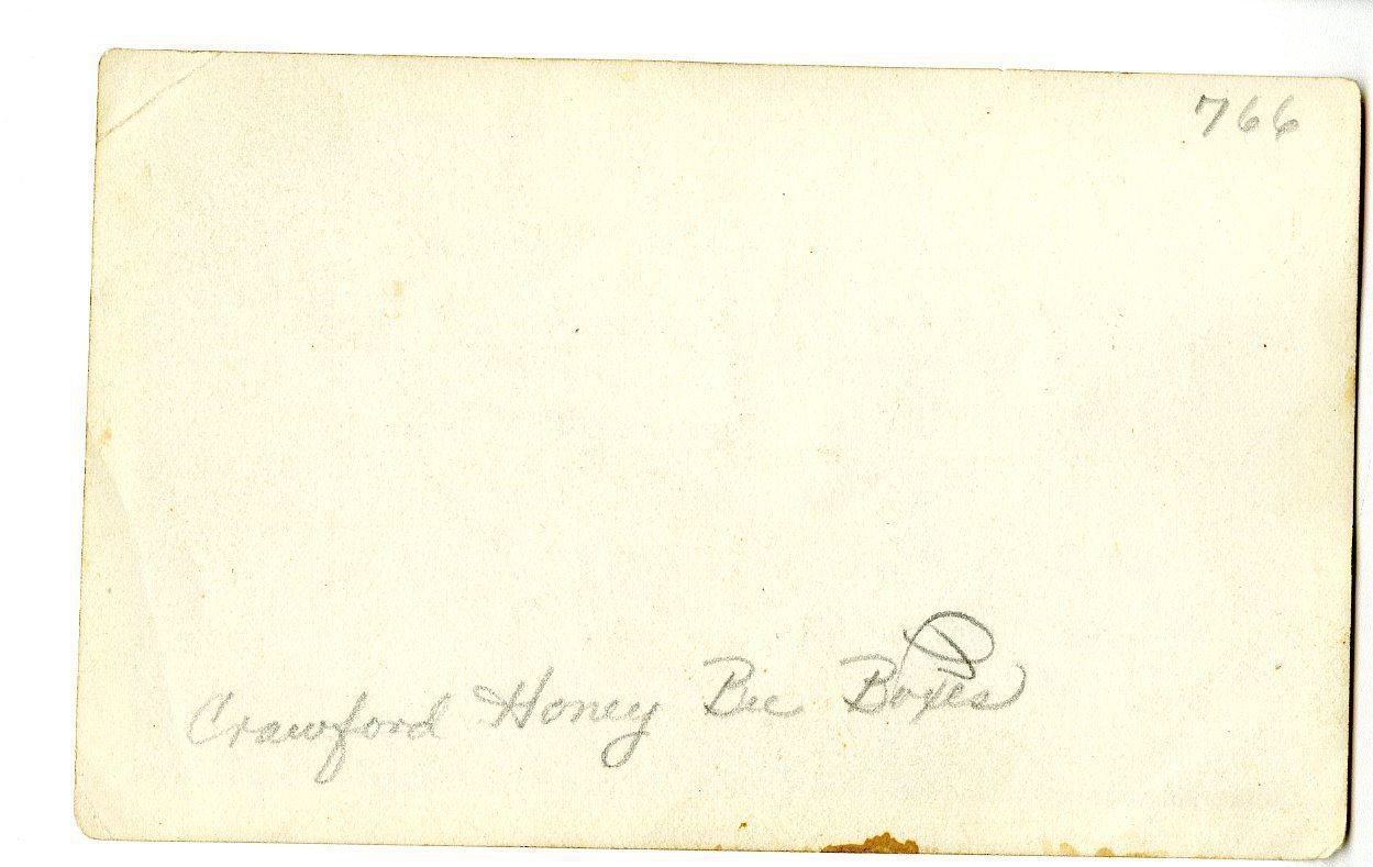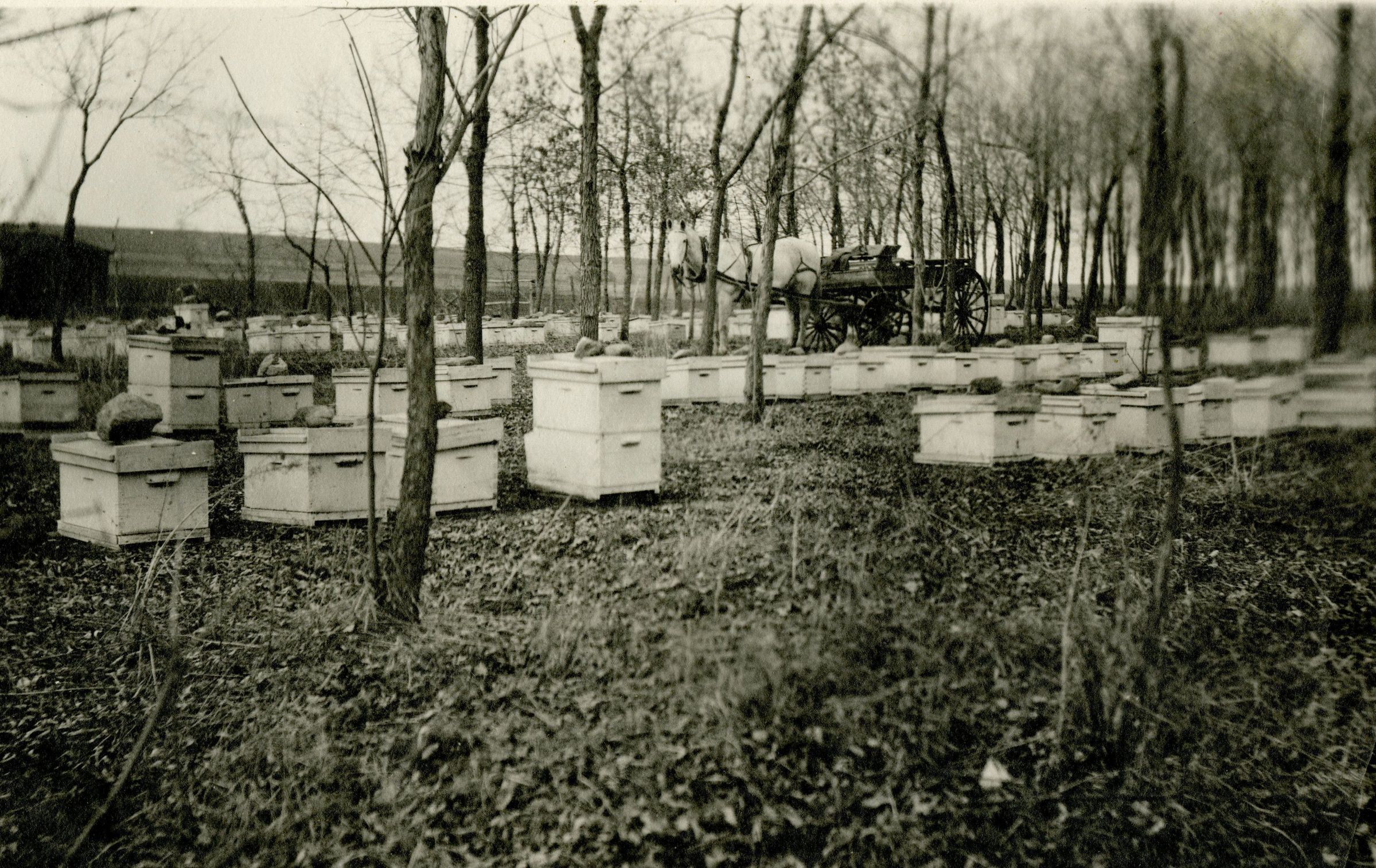 Photograph of the honey bee boxes on the Crawford farm. There is a white horse pulling a cart in the center. Original. Possible shed on the far left of the image.