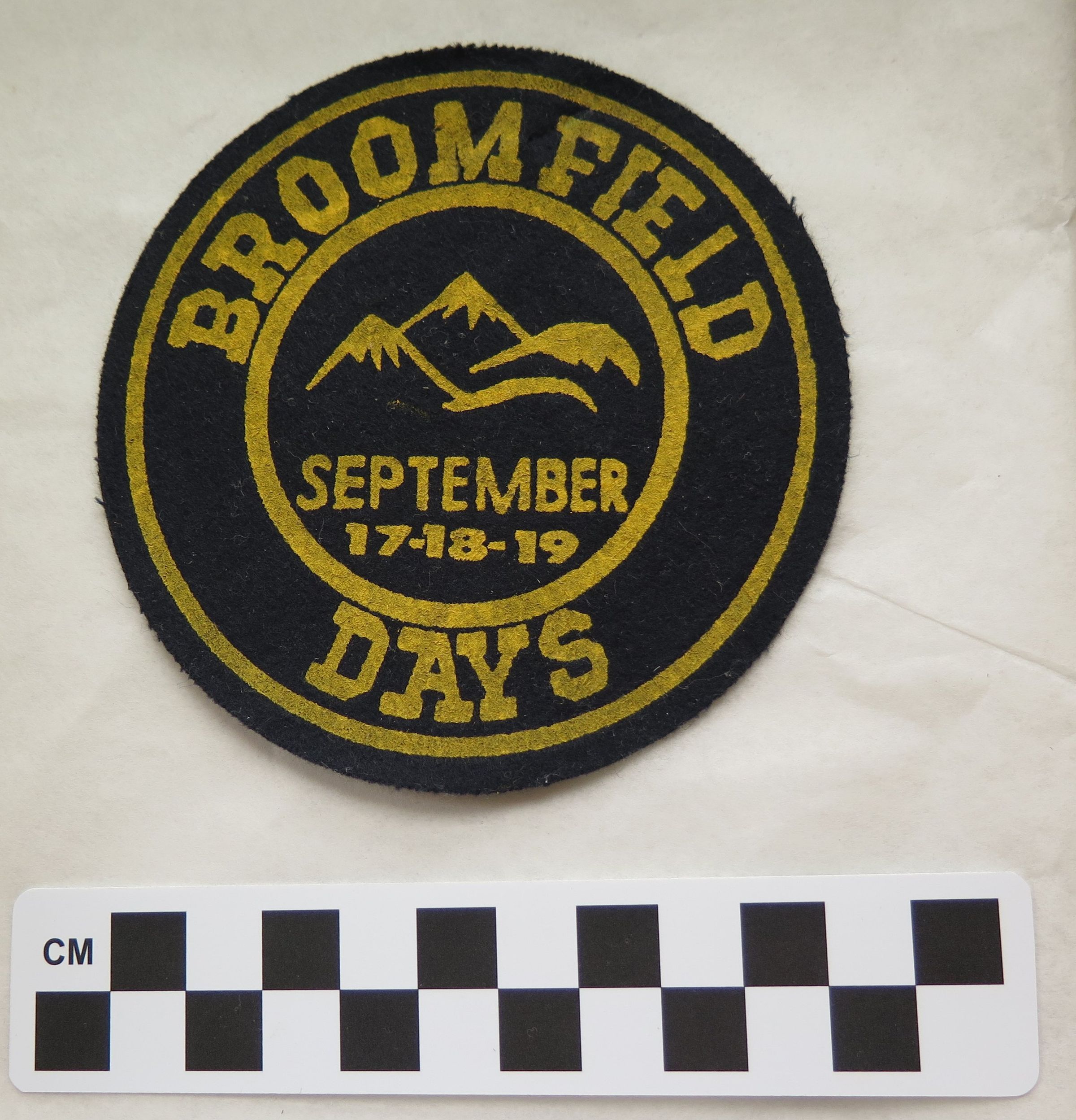 This is a round black Broomfield Days patch with yellow text on the front. The text on the front of the patch reads, "Broomfield/ September/ 18-19-10/ Days". In the center of the patch is the image of mountains. The patch measures 3.75" (dia).
