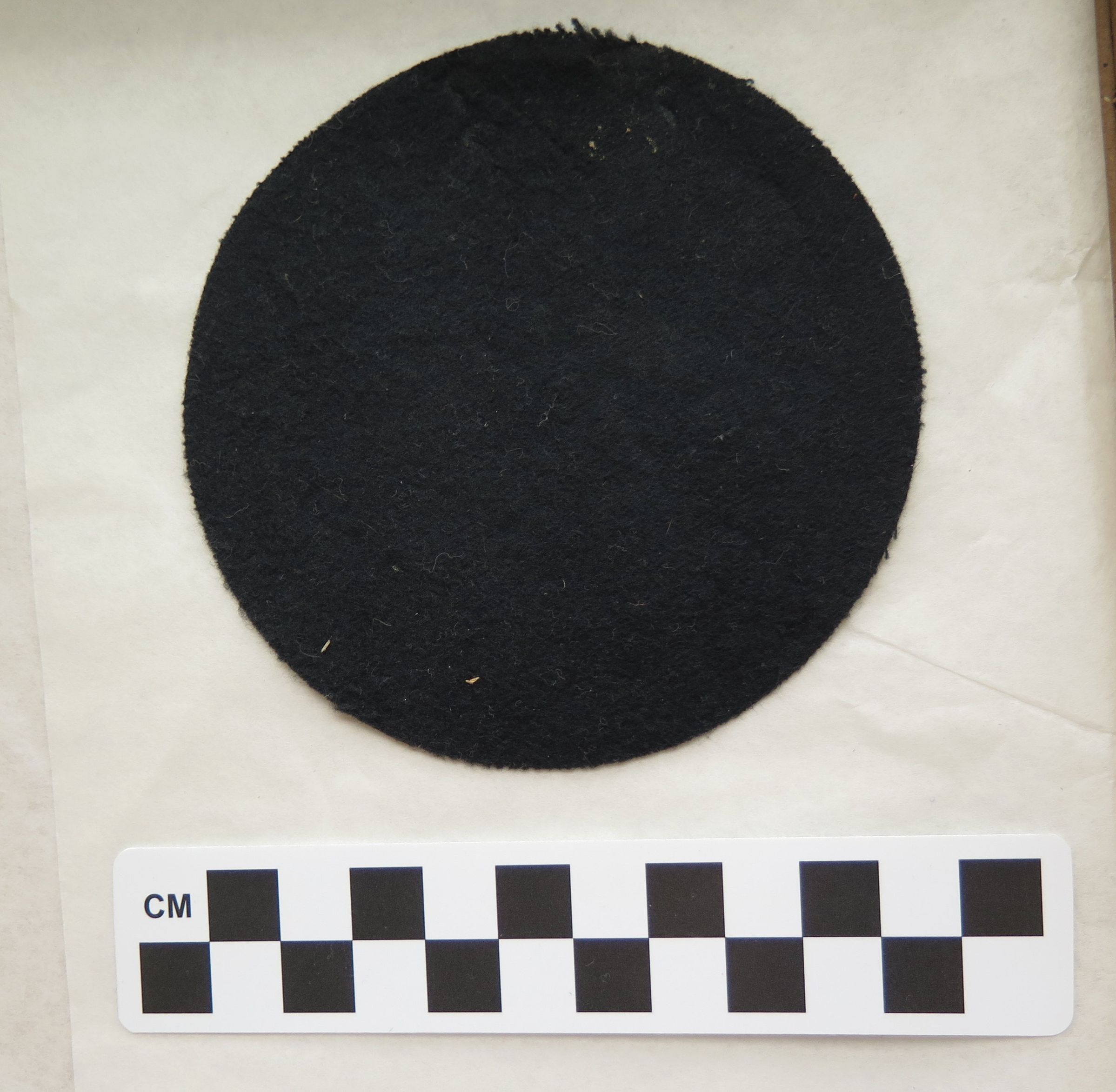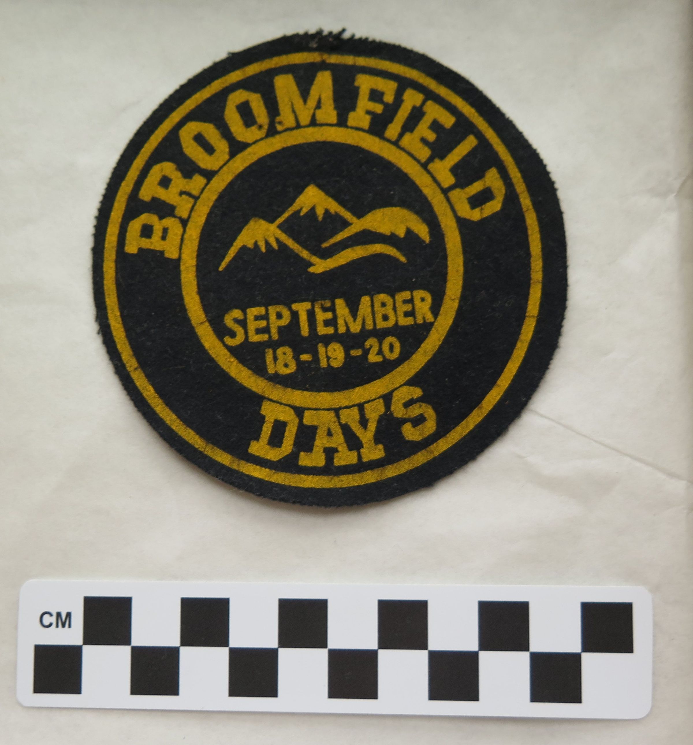 This is a round black Broomfield Days patch with yellow text on the front. The text on the front of the patch reads, "Broomfield/ September/ 18-19-10/ Days". In the center of the patch is the image of mountains. There is a frayed section and a hole at the top of the patch, right above the M in Broomfield. This was caused by a safety pin that was attached to the patch when it arrived at the museum. The patch measures 3.75" (dia).