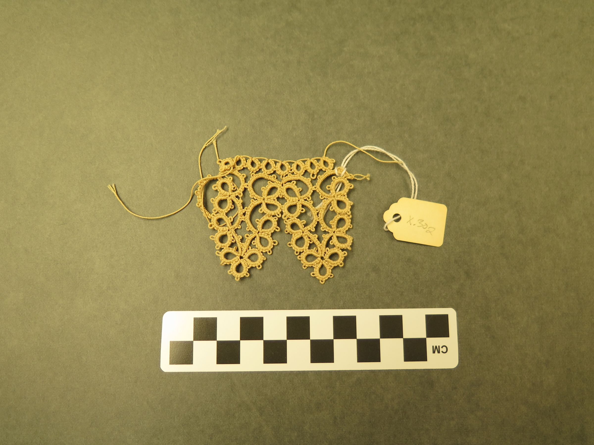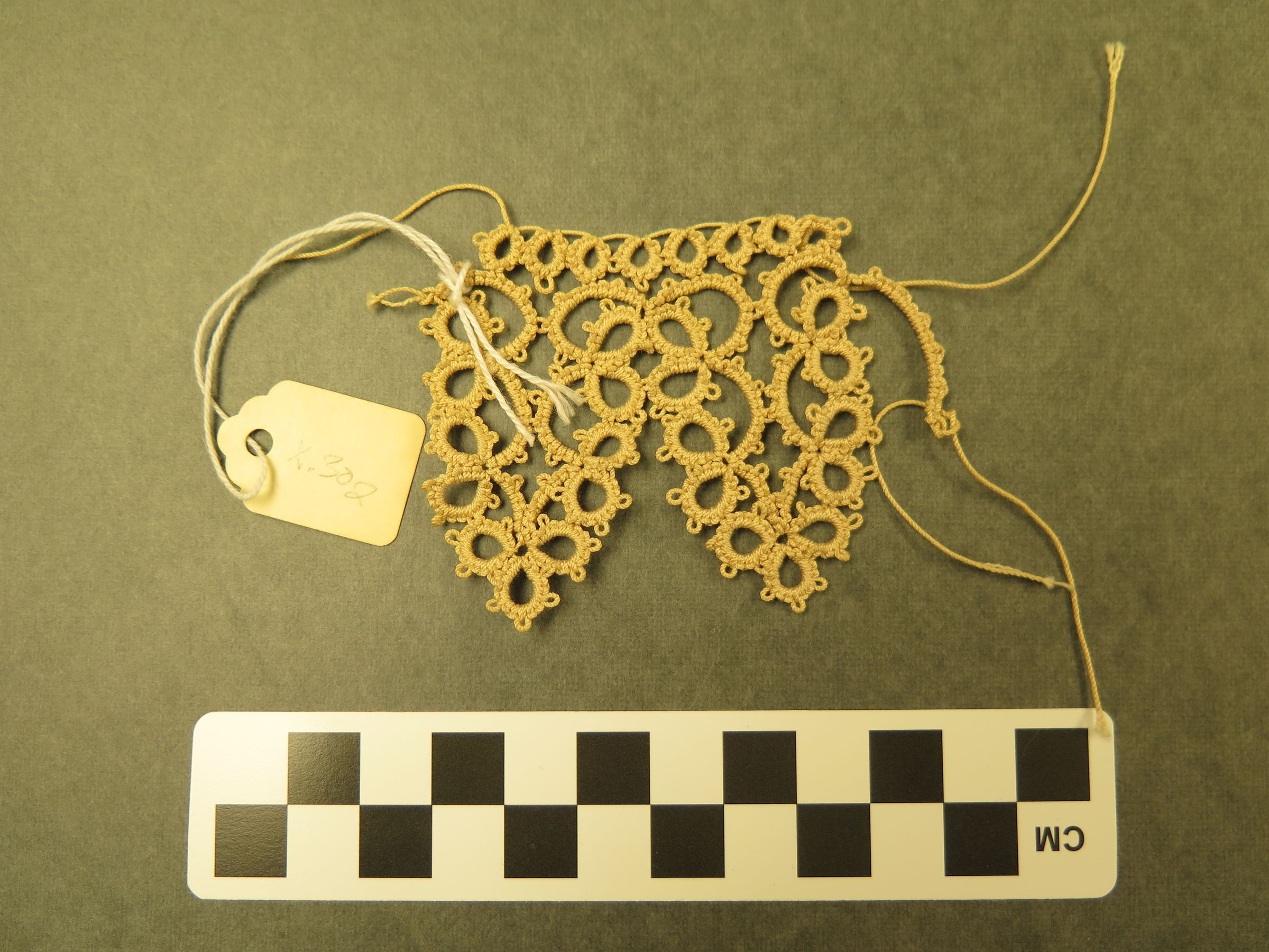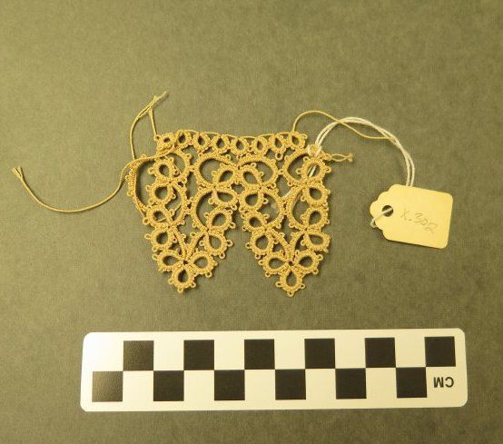 This is a cream colored piece of lace tatting. The tatting measures 2" (w) x 2.5" (l).
