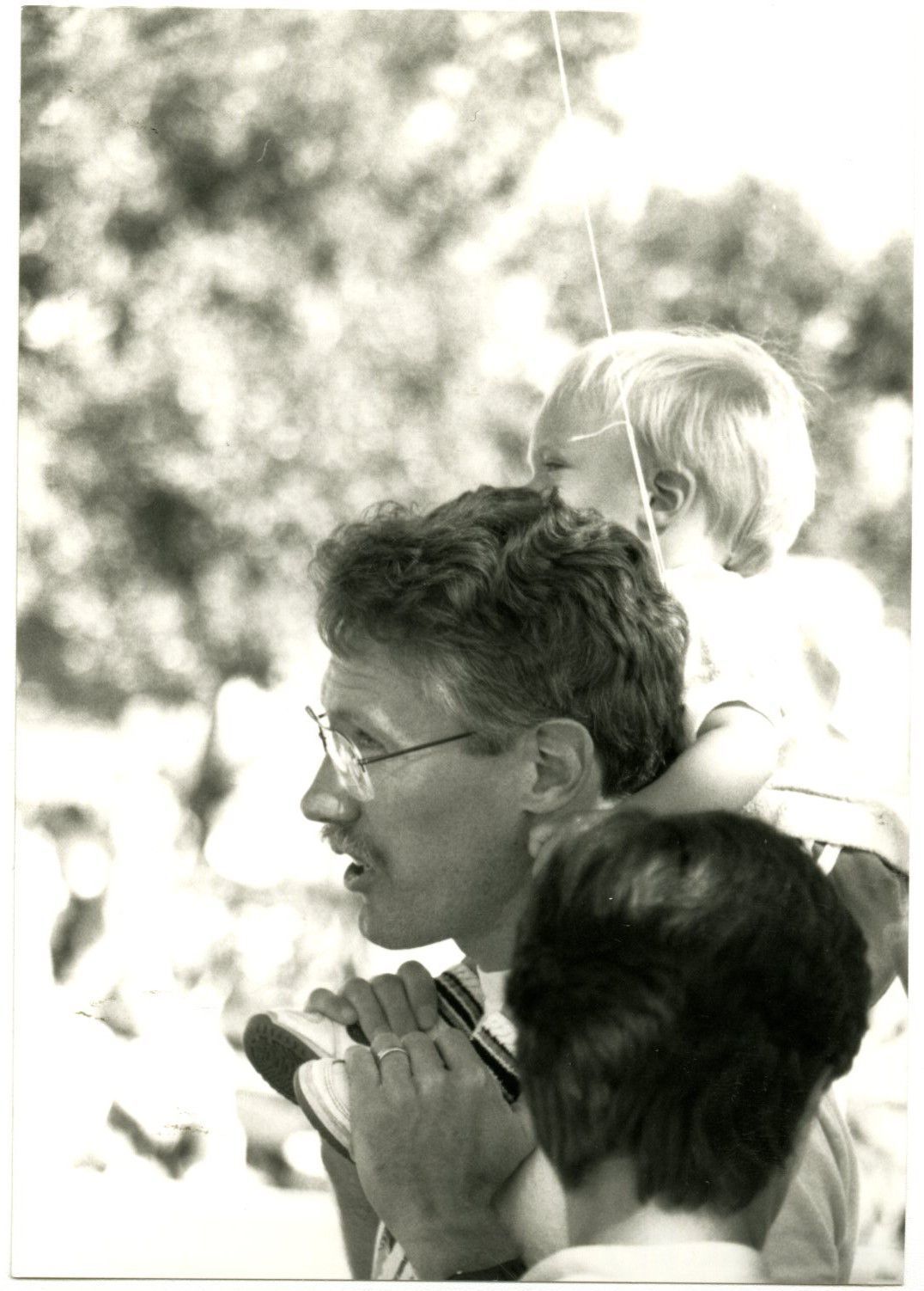 Item is a black-and-white photograph taken during the 1989 Broomfield Days celebration. The photo centers around a man with curly hair and glasses, who has a young boy (most likely his son) sitting on his shoulders. There appears to be the string of a balloon in the toddler's hand, and in the forefront of the image, the back of someone's head is visible. In the background, blurry trees and groups of people can be seen, most likely watching the parade from the side of the street.Photograph Details